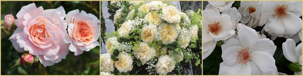 La segunda rosa es Rosa‘Eirene’, una rosa floribunda criada por Rosen Tantau en Alemania, que conmemora el centenario del final de la Primera Guerra Mundial. Sus brotes florales de color crema-albaricoque se abren a flores de pétalos de color blanco brillante; son ligeramente perfumadas y sus pétalos son resistentes a la lluvia.
