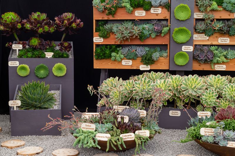 Para que el verano caluroso y seco no asuste a los amantes de la jardinería, no podía faltar un stand con plantas suculentas. Entre ellas, destacaban las coloridas hojas variegadas de Aeonium ‘Sunburst’, las hojas oscuras de Echeveria ‘Black Prince’ y Echeveria agavoides ‘Ebony’, con hojas puntiagudas con la punta en color púrpura.