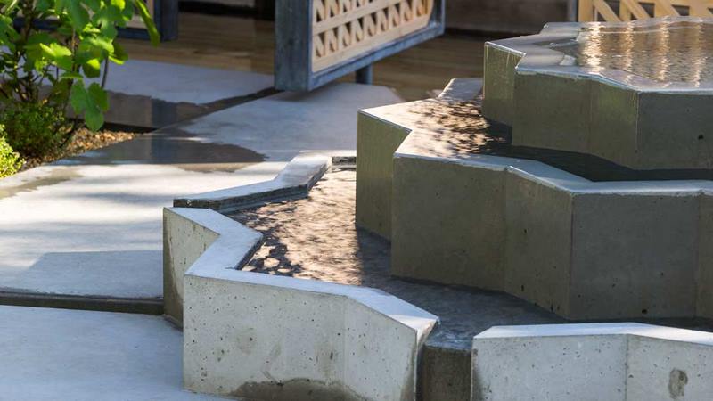 En el diseño de este jardín se han empleado los mismos materiales que se encuentran disponibles en los campos de refugiados. El hormigón y el acero se han transformado en piezas de inspiración islámica. La textura y el color de la plantación se encarga de suavizar los elementos duros.