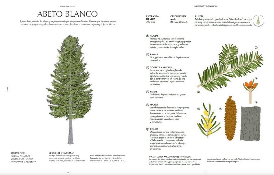 Los siguientes capítulos, casi la totalidad del libro, nos ayudan a identificar los árboles mediante unas fichas a doble página documentadas y muy accesibles en las que se incluyen ilustraciones; el nombre común y científico; e información sobre la silueta de árbol, el número de especies, el crecimiento, los elementos clave que permite reconocer un árbol a primera vista (forma de las hojas, fruto, etc.), los usos, la estación y algún que otro secreto sobre la especie.