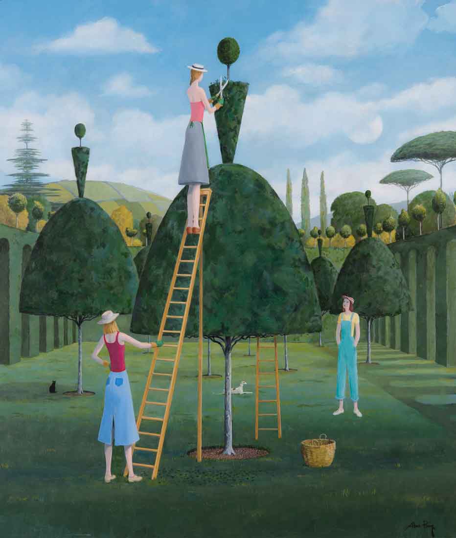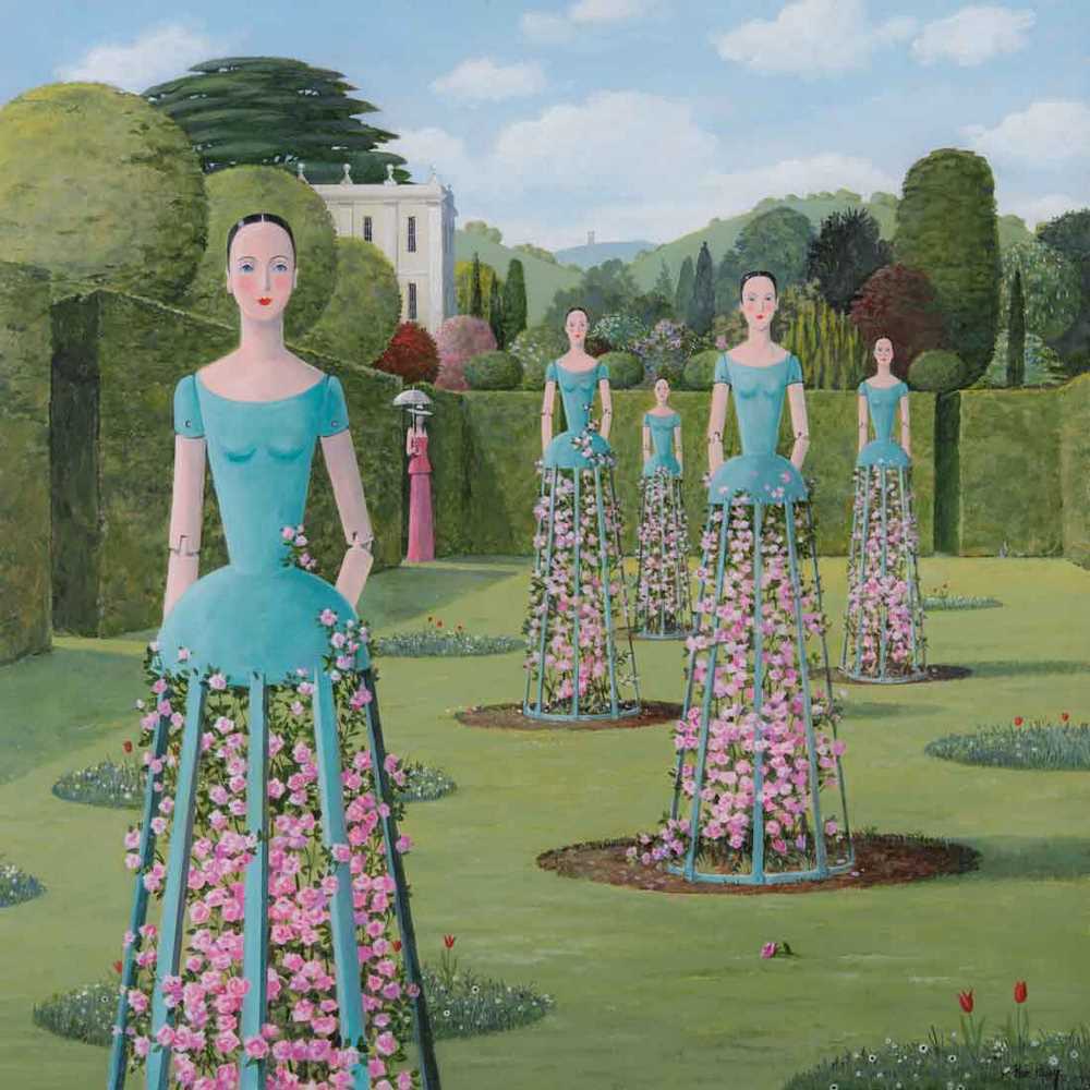 Hoy en día, está considerado uno los mejores pintores paisajistas contemporáneos de Inglaterra. Con lienzos donde los árboles y las flores se distribuyen para captar sensualmente la atención de la mirada. Una estructura y simetría que fascina e inquieta a la vez. Unas piezas topiarias casi imposibles. Un sueño que nos conduce por las grandes estructuras y elementos formales de los jardines campestres ingleses. Un cálido paseo con algunos episodios inquietantes.