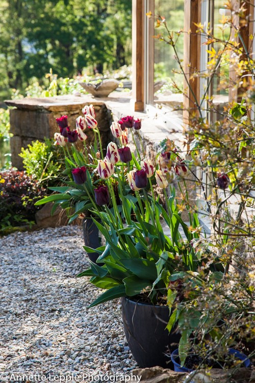 Construyeron un invernadero y una terraza elevada. Allí la paleta de plantas es menos exuberante y mucho más restringida. Pittosporum ‘Tom Thumb’ recortado, cubresuelos a base de Rosa ‘Vesuvia’ y Lavandula x intermedia ‘Edelweiss’ se mezclan con Clematis tubulosa ‘Cassandra’, Clematis mandshurica, Clematis ‘Huldine’, Clematis ‘Pink Flamingo’; Alliums y Narcissus ‘Baby Moon’ que ofrecen interés durante la primavera.