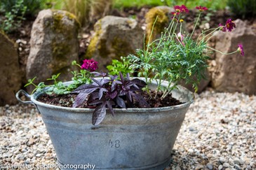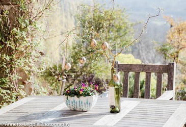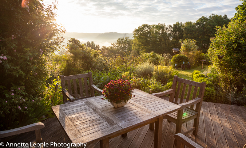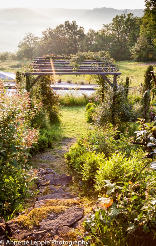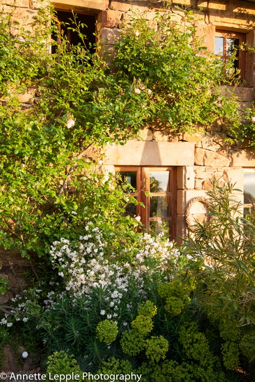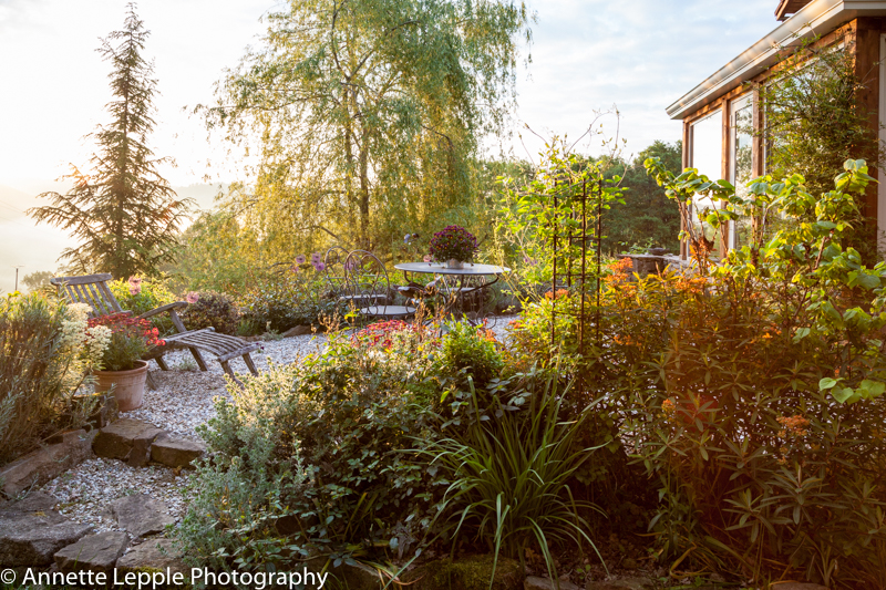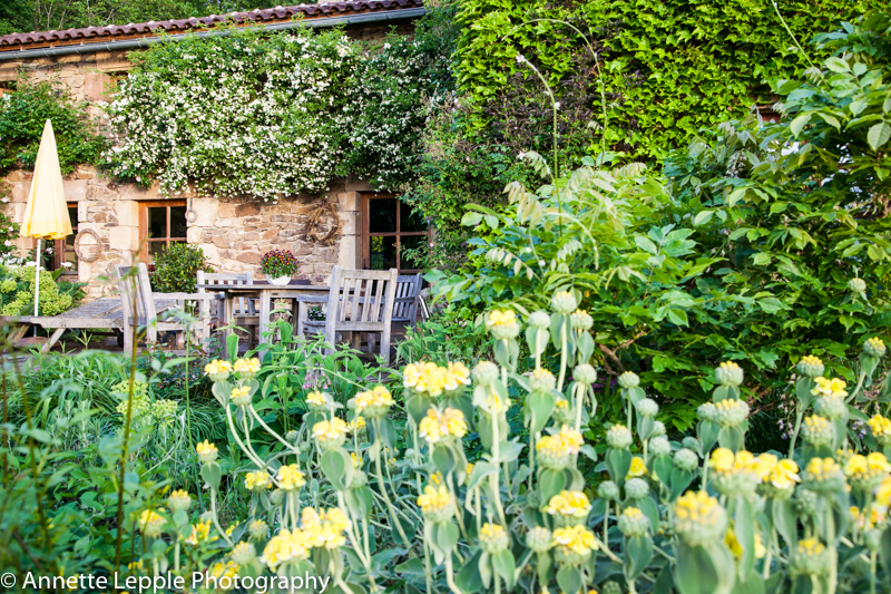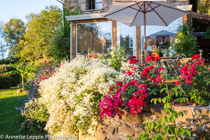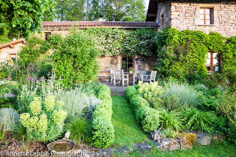 Annette comienza la descripción de su jardín de 0,5 hectáreas, comentando que lo primero que realizaron fueron las fronteras que rodean la terraza principal. En esa zona se había encontrado con un suelo pobre, con montones de piedras, rocas y malahierba. En esa zona creó un ambiente romántico y relajado gracias a plantación exuberante que enmarcó con cierto orden, en un intento de mostrar la mano del jardinero en esa ejecución. No obstante, no suele podar hasta el final de la temporada invernal, puesto que en esa zona los inviernos son suaves en comparación a lo que había vivido en su anterior casa en Suiza. Por el contrario, aquí la escarcha suele ofrecer hermosas imágenes sobre las plantas, tal y como pudo verse en el reportaje que se publicó el pasado mes de diciembre de 2015 en la revista Gardens Illustrated.