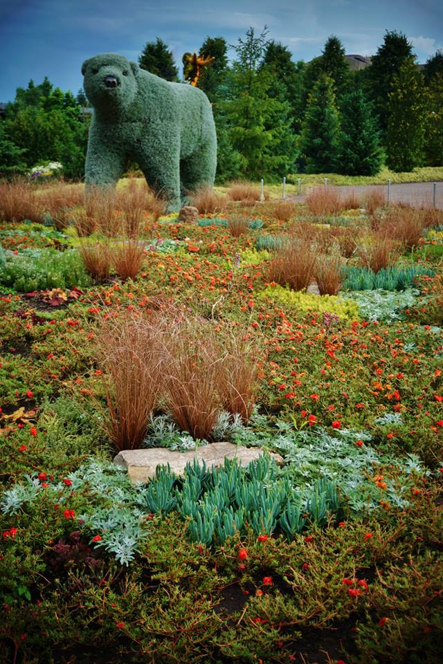 O un vistoso oso polar hecho con Helichrysumy se muestra caminando a través de una alfombra vegetal muy baja, propia de la tundra ártica, que se ha formado con plantas de Portulaca, Carex, Senecio y Artemisia.