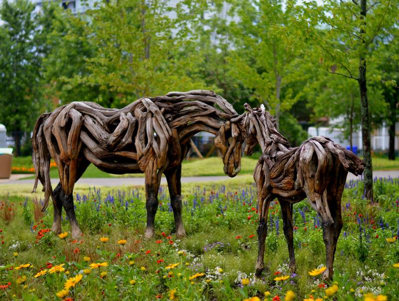 Los caballos, construidos con ejemplares de Carex, cabalgan por un prado a base de Lantana, Pennisetum y Rudbeckia.