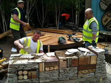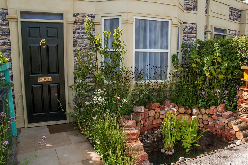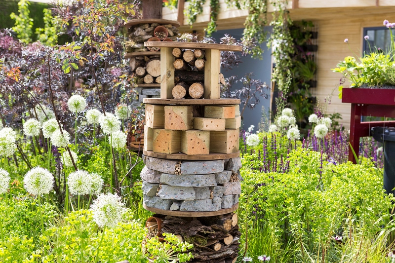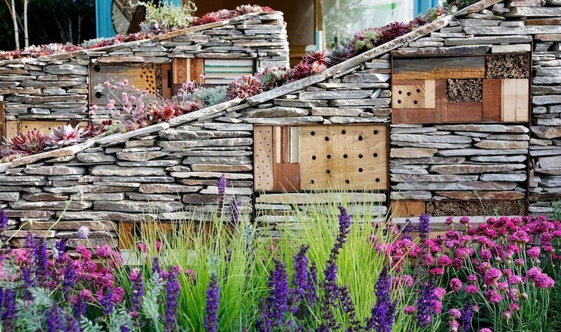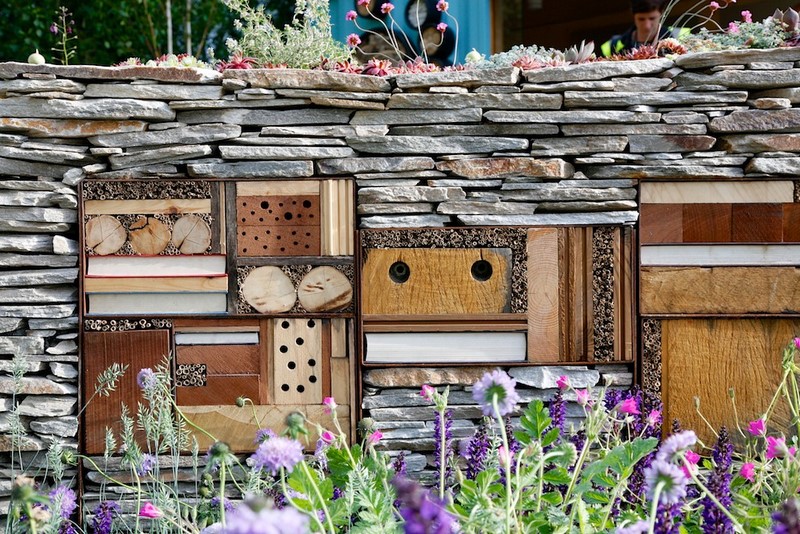 Claro que, podemos hacer el “más difícil todavía” y convertir ese muro en un elemento más sofisticado y vistoso, asegurándonos, al tiempo, de que una parte de la fauna silvestre tenga asegurado su espacio por derecho propio. Eso sucede, por ejemplo, si a esa pared de piedra le incorporamos una casa u hotel para insectos con todo lujo de detalles. Un buen ejemplo lo vimos en el jardín de Nigel Dunnet (The New Wild Garden) que presentó en RHS Chelsea Flower Show en el año 2011 (ver aquí).