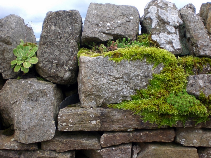 Si la pared de piedra ya estaba construida antes, lo más probable es que la flora silvestre haya colonizado más de hueco disponible. Musgo, hepáticas, geranios (Geranium), helechos o hiedra forman parte de esa vegetación que habitualmente crece entre las piedras de los muros. En el caso de que no sea así, se puede alentar el crecimiento de vegetación colocando algunas semillas junto a un puñado de sustrato.