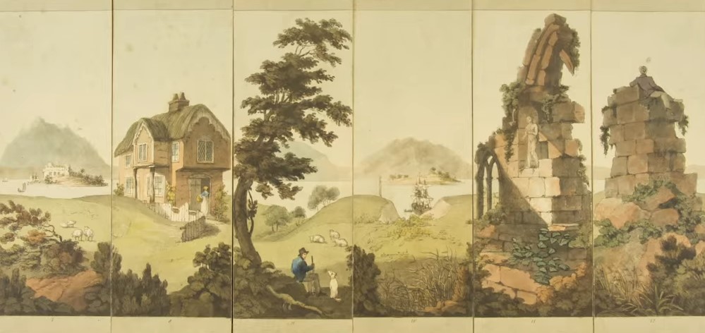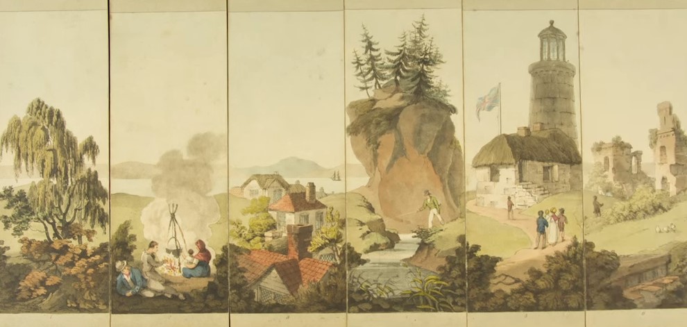 En 1824, el editor londinense Samuel Leigh contrató a John Heaviside Clark para que diseñara un myriorama de dieciséis paneles con escenas, pintadas en aguatinta y coloreados a mano. Las pinturas no representan ningún lugar en particular, pero se identifican claramente como escenas parciales de paisajes británicos. Cada panel estaba numerado en la parte inferior, lo que supuso una innovación que permitía recrear nuevamente las escenas que habían resultado especialmente agradables, grabando la combinación de números.