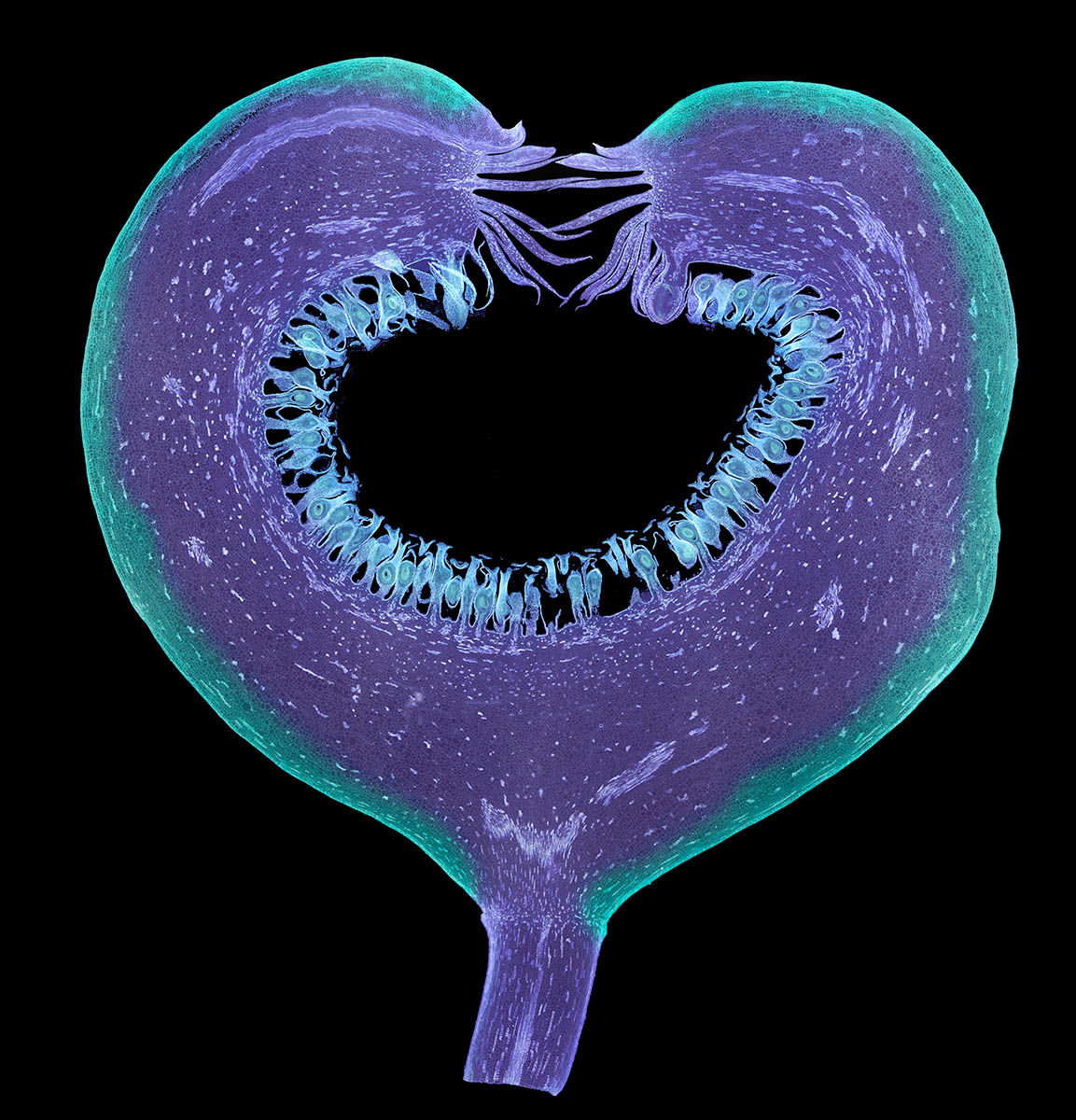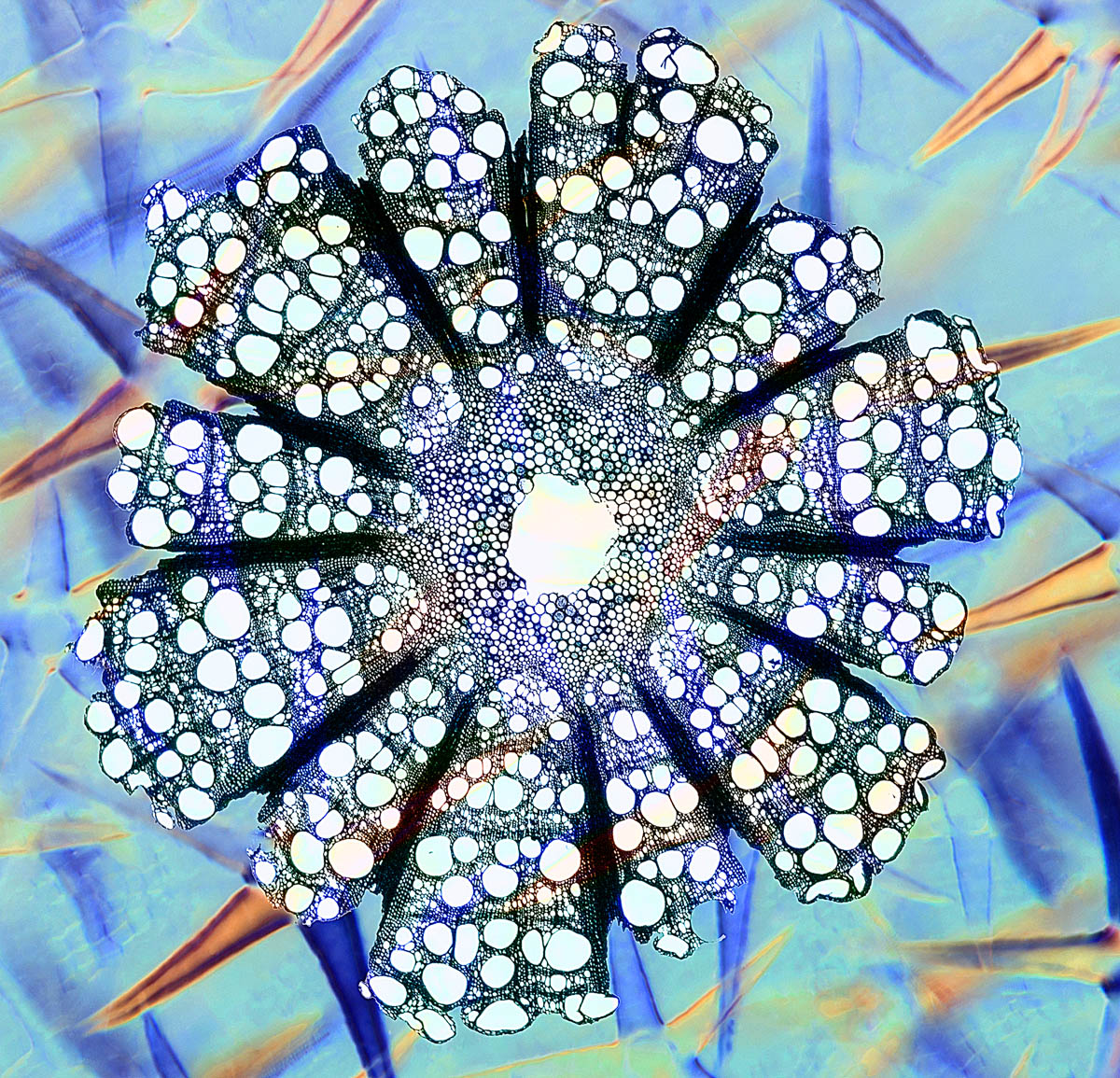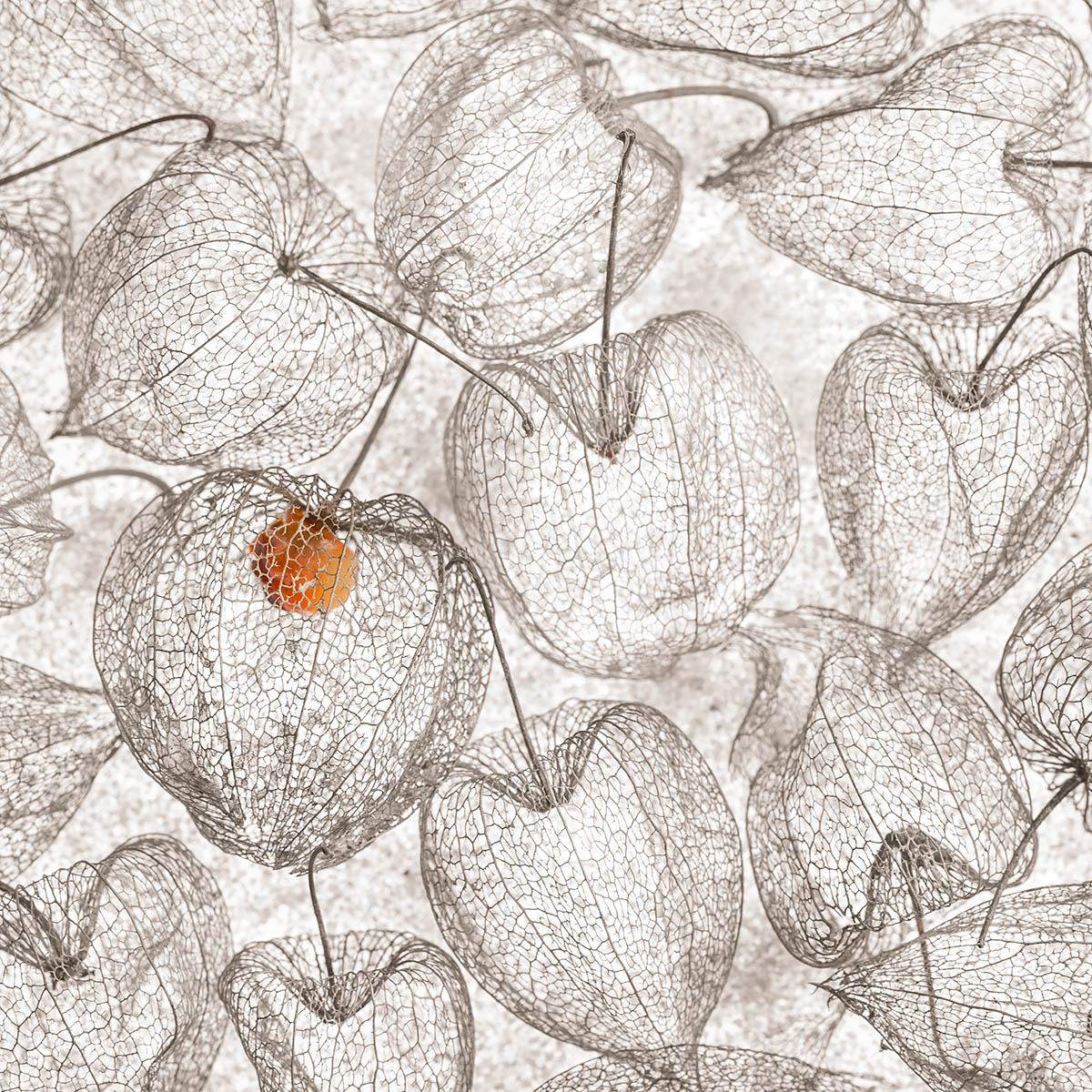 La fotografía de grupo de esqueletos de Physalis en contraste con el fruto rojo fue tomada en una mesa de luz con arena blanca. No tan reconocibles, los pelos de la hoja estrellada de Deutzia y una sección transversal de un tallo de Clematis en una fotografía realizada con un microscopio de luz polarizada.