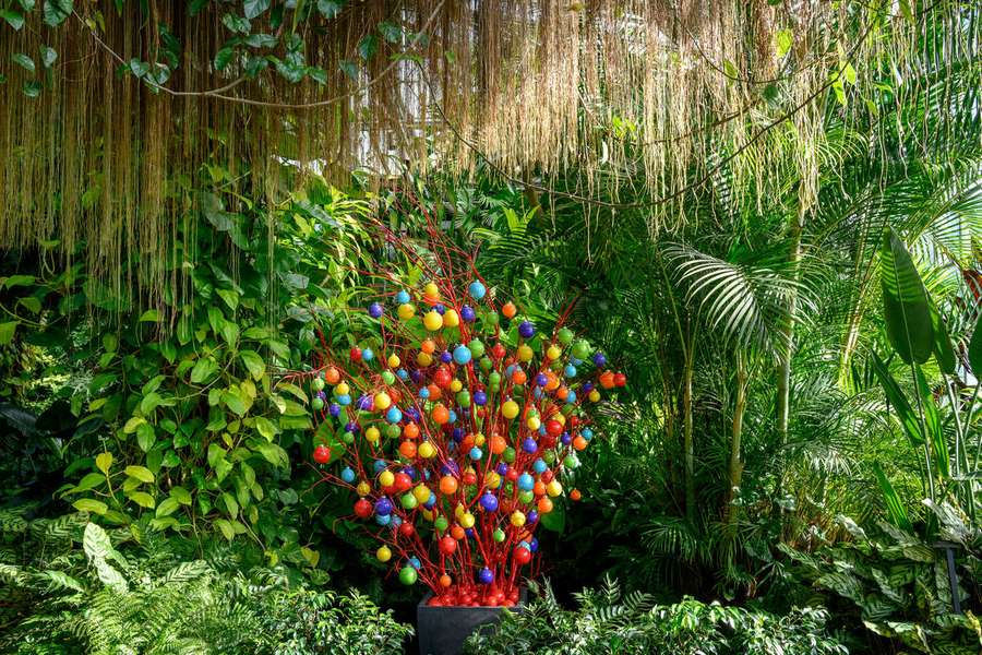Las figuras de la naturaleza también están representadas en la entrada del Conservatorio Este, con un fascinante contorno en capas a base de conos de pino rodeados de coronas y guirnaldas. No faltan elegantes cristales en forma de lágrima que gotean sobre el árbol de Navidad en el Ballroom, o círculos en forma de bolas de vidrio suspendidas en la Terraza Tropical.