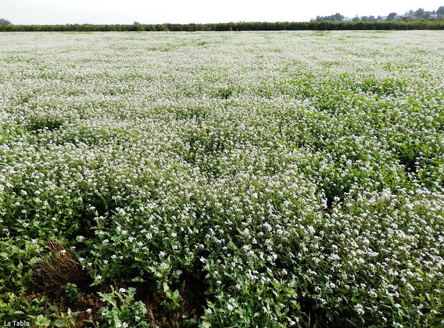Ahora, gran parte del terreno está sin cultivar. Algunas zonas en barbecho pero otras no, a juzgar por la cobertura de jaramago blanco. Una pena, pero, puesto que casi tenemos una invernal estampa ‘nevada’, os muestro como va avanzando el jaramago blanco (Diplotaxis erucoides) por toda la zona.