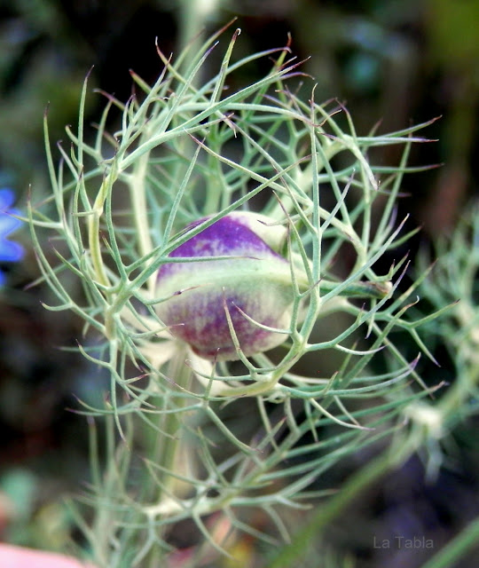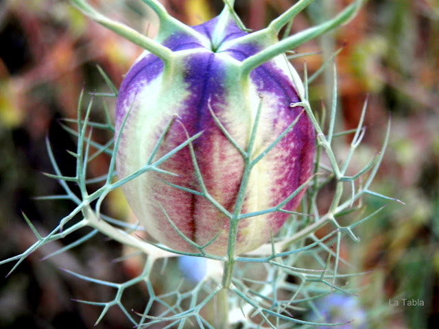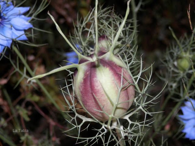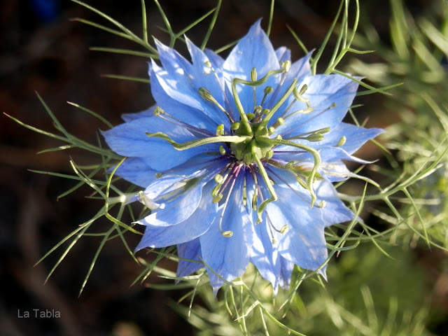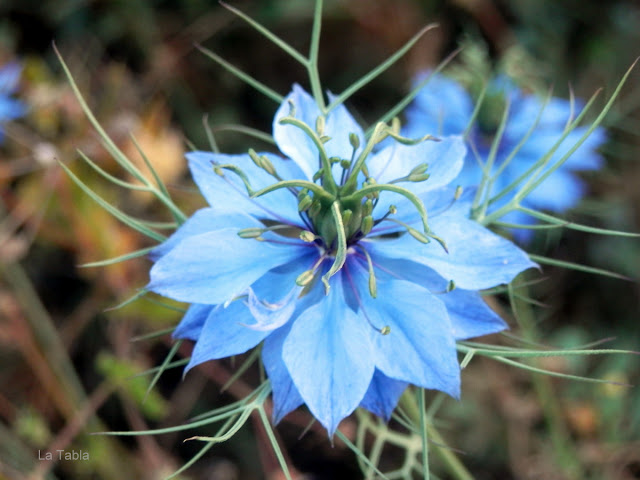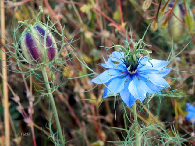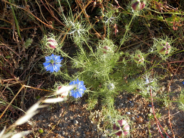 Esto fue lo que encontré el otro día mirando de un lado a otro, en silencio, en compañía de los pájaros y de algún que otro conejo que cruza rápidamente. De un azul tan intenso que resulta imposible no descubrir su presencia. Aquí habla principalmente el color y lo hace a gritos, cierto, pero no molesta. Es una Nigella damascena también denominada Nigella bourgaei y con infinidad de nombres comunes, entre ellos: arañuela, ajenuz de jardín, damascena de Cienfuegos, cabellos de Venus, amor en la niebla o demonio de los arbustos. Mira si no dices cosas, así, sin hablar.