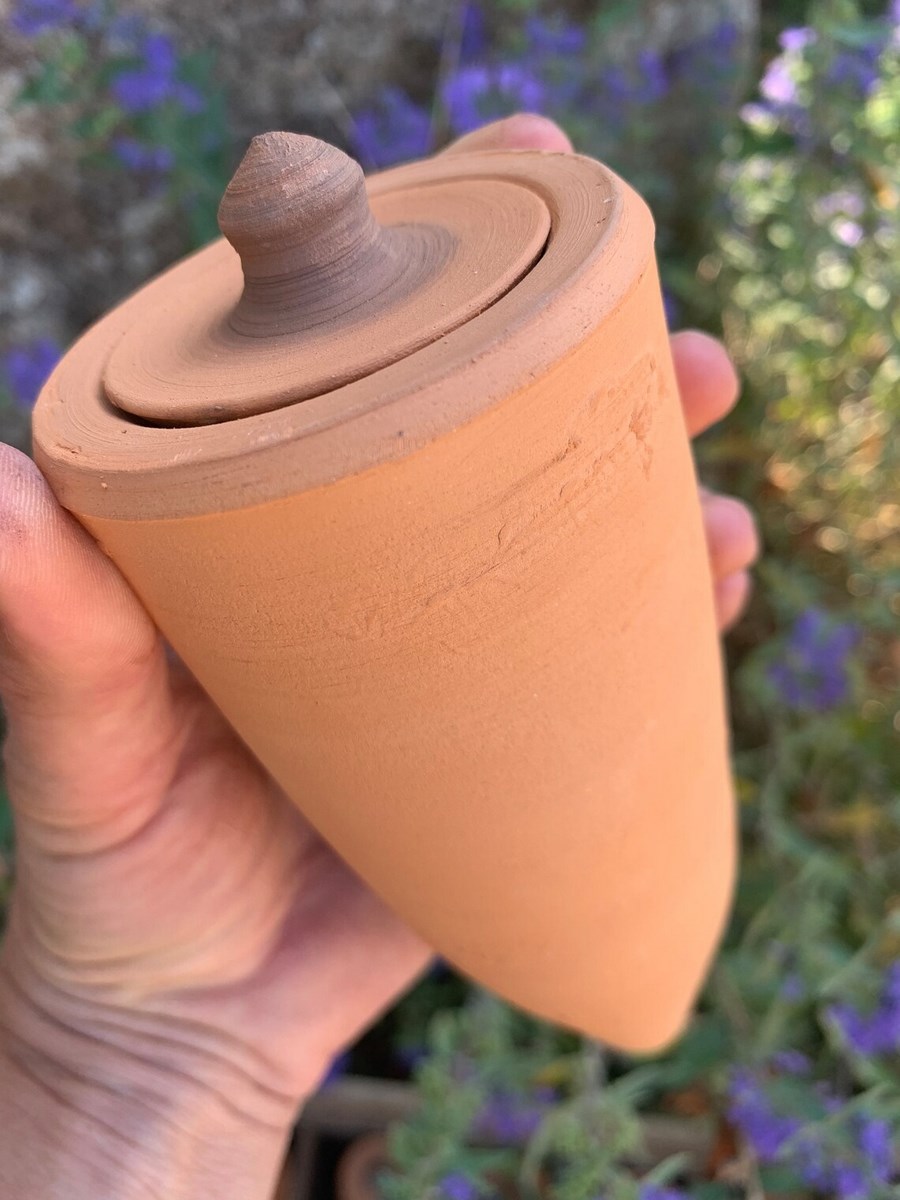 Olla de autorriego subterráneo de terracota. Capacidad: +/- 3 litros. Autonomía de 5 a 10 días con un radio de acción de 30 cm.