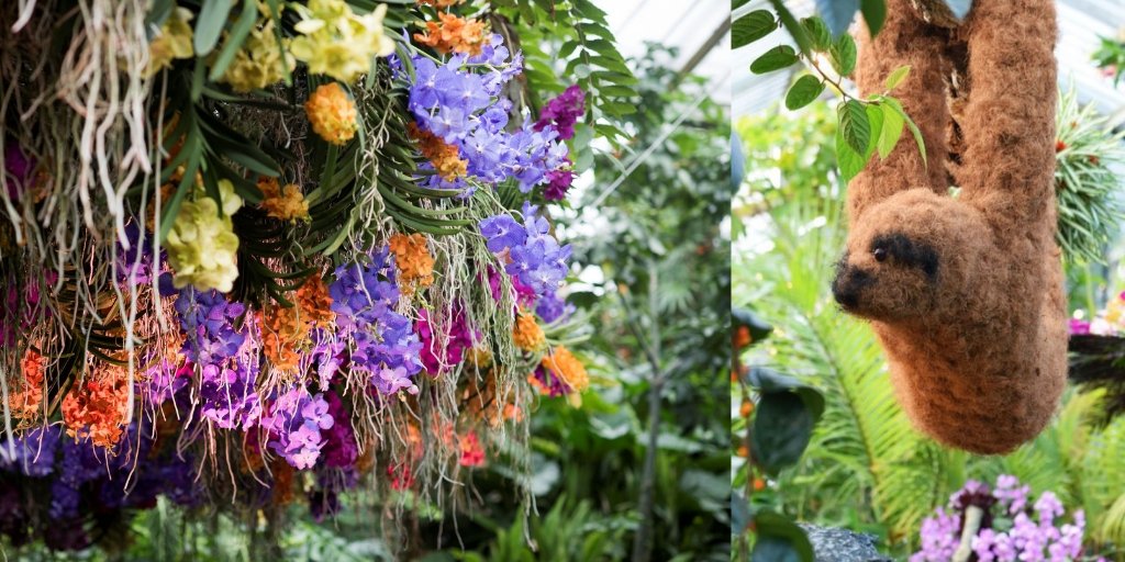 La exhibición principal está formada por un carnaval de animales. En la instalación se representan un tucán en vuelo, un divertido perezoso colgando y una tortuga nadadora.