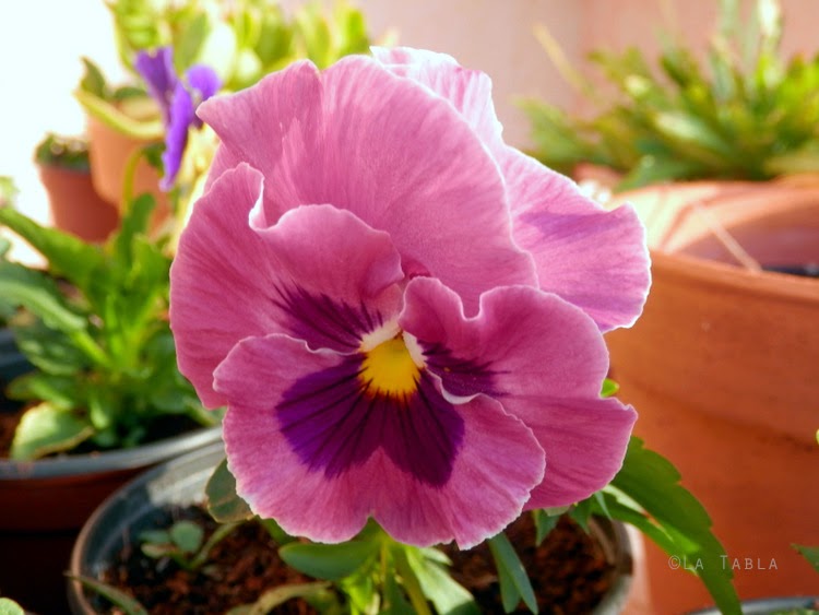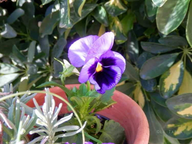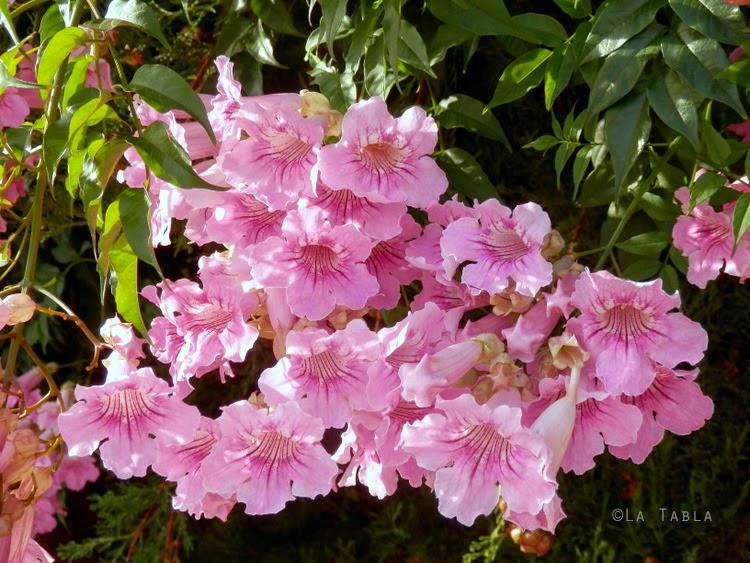 El otoño promete ser igual que el del pasado año: tenemos tiempo de verano y día corto de otoño. Y entre crisantemo y crisantemo, alguna que otra rosa, siempre rosas, hasta el final de otoño. En color rosa la Podranea ricasoliana que cuelga muy relajada, como si no tuviera prisa en marcharse. Los pensamientos también están en la fiesta, porque es tiempo de violas en el jardín(en el calendario, claro) pero todavía no han bailado ni hablado con nadie, pobres, están despistados. La Scaevola aemula que pasaba por el otoño y se ha quedado. Las hojas del viejo ciruelo que se ponen muy, pero que muy coloradas (no sé bien si del calor o del otoño).