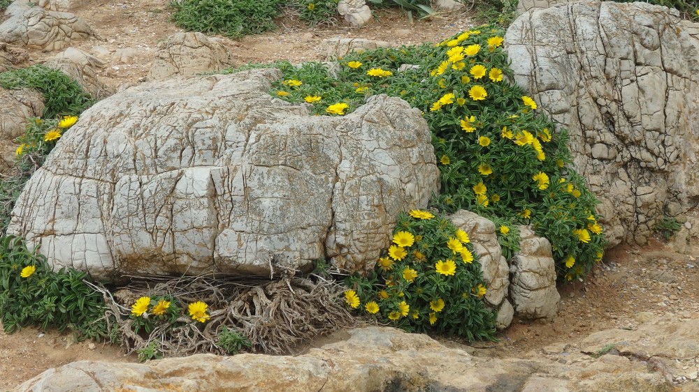 En suelos pedregosos o arenosos, en grietas de paredes de edificios antiguos o en ambientes litorales secos. Pallenis maritima, una planta rupícola mediterránea tolerante a la sequía que florece casi todo el año, muy utilizada en jardinería de secano, en rocallas y en jardines costeros por su excelente comportamiento como cubierta vegetal.