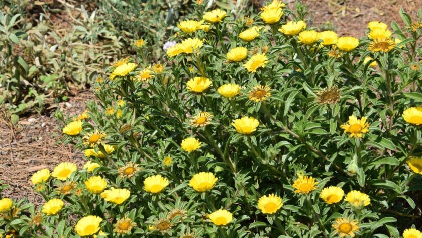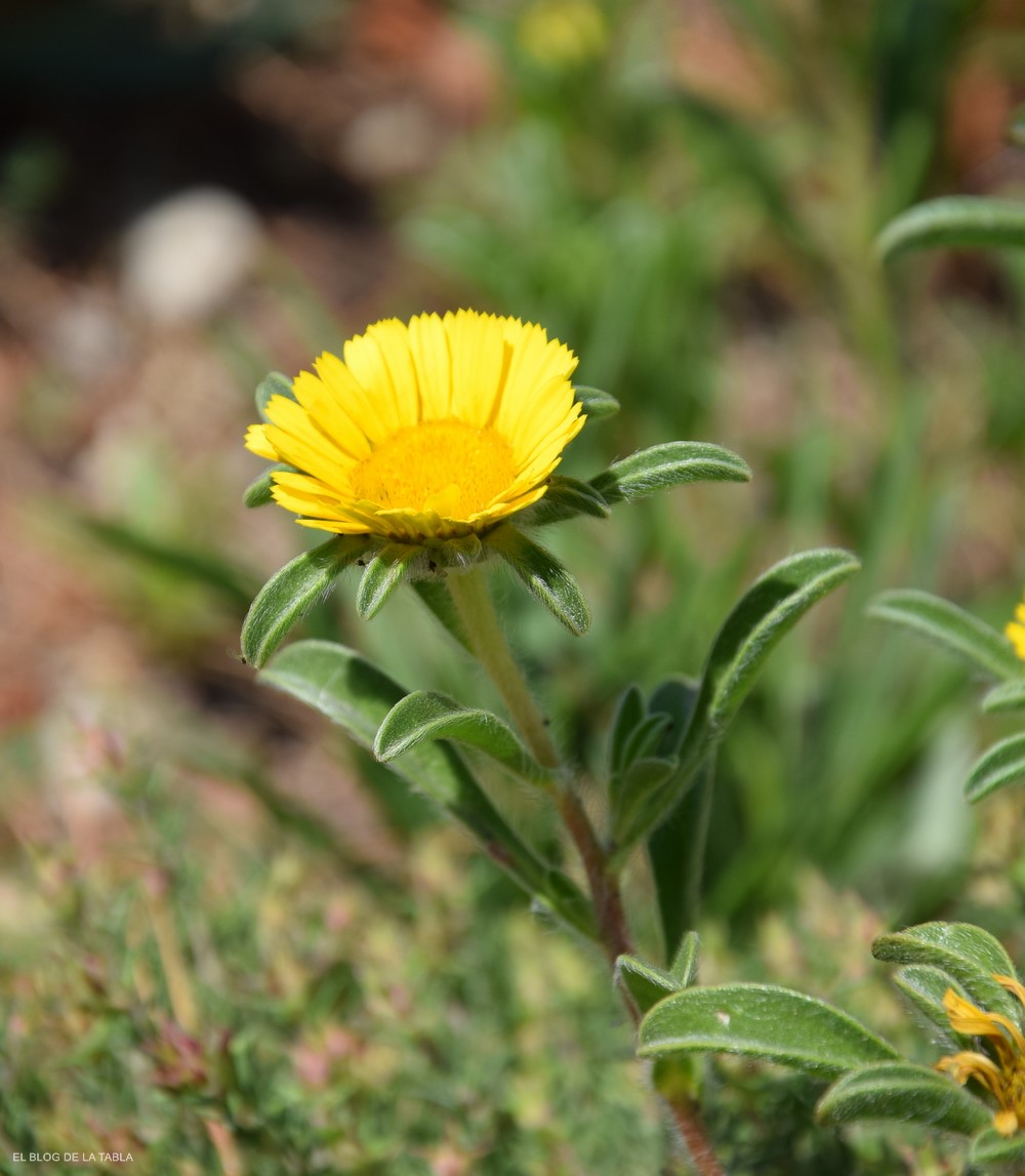 Con tallos leñosos y ramificados, tiene hojas alternas gruesas, de hasta 3 cm de largo y 1 cm de ancho, de color verde oscuro grisáceo y cubiertas de pelos rígidos y ásperos. Las flores, en forma de margarita de 3-4 cm y color amarillo vivo, se producen casi todo el año, en especial desde la primavera hasta bien entrado el verano. En el jardín