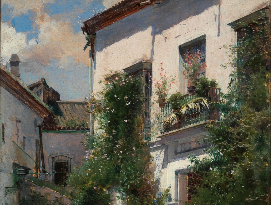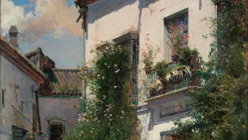 También vamos a observar un suelo empedrado y un descuidado tejado en el edificio del fondo, donde han ido arraigando plantas silvestres. No faltan toques de color de la enramada cuajada de flores. La fachada encalada del patio apenas se ve entre los jazmines trepadores (Jasminum grandiflorum) que tamizan la luz del medio día. Sobre el balcón una ancestral costumbre nacional, una palma procedente de la procesión del Domingo de Ramos.