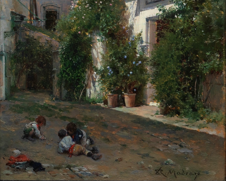 No podía faltar un patio en primavera y, sin duda, un buen lugar para buscar un patio es Sevilla. Allí vamos a ver cómo tres niños juegan al gua (canicas) en un apacible y soleado día de primavera.