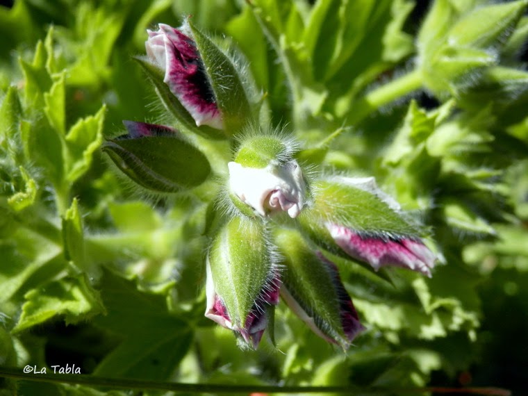 Son las primeras flores de esta temporada del Pelargoniumgrandiflorum ‘Imperial’, que alcanza una altura de 28 a 30 cm, con hábito de crecimiento compacto. La inflorescencia está formada por una cabeza con 10 o 12 florecillas en umbela. Cuando está completamente abierta, cada flor tiene entre 2,5 y 3,5 cm y cinco pétalos y el tamaño total de la umbela es de 5 a 6 cm. El centro del pétalo siempre es más oscuro y el borde blanco, con venas que comienzan en la base y se irradian hacia los lados.