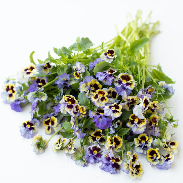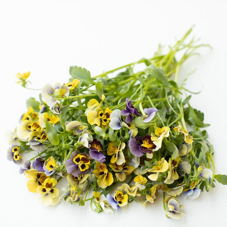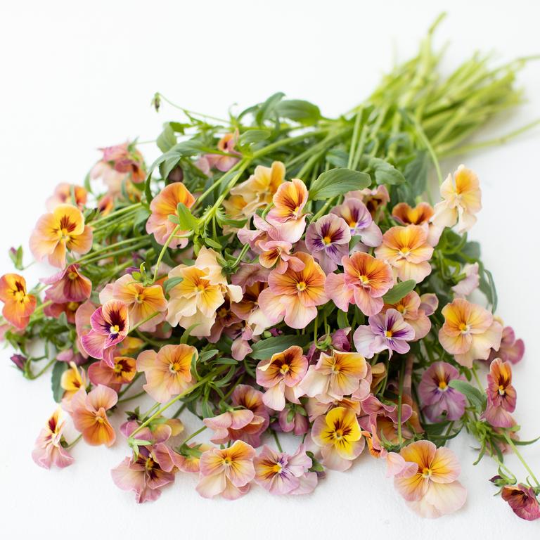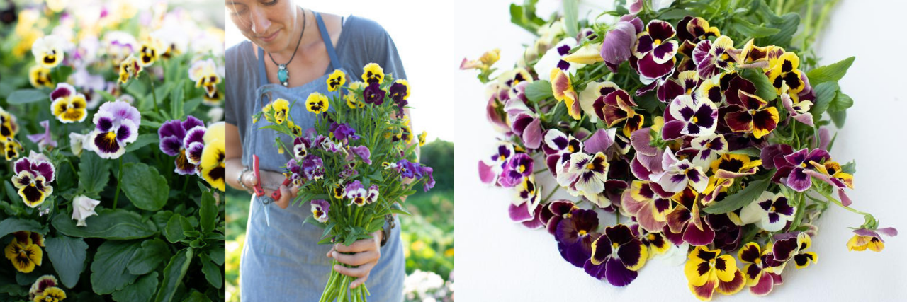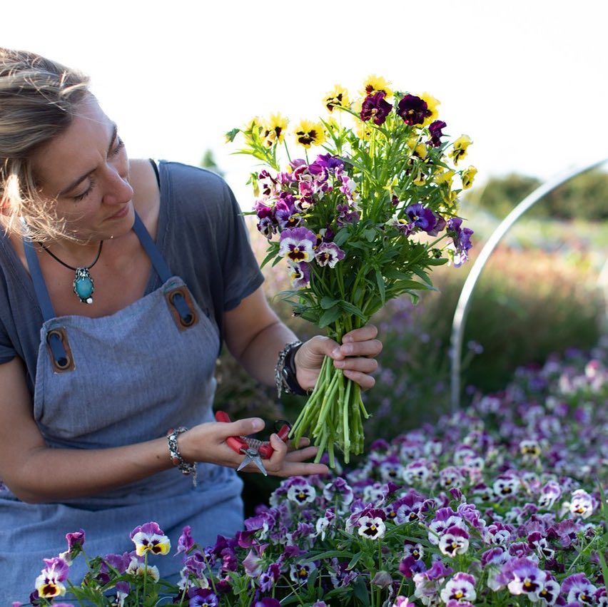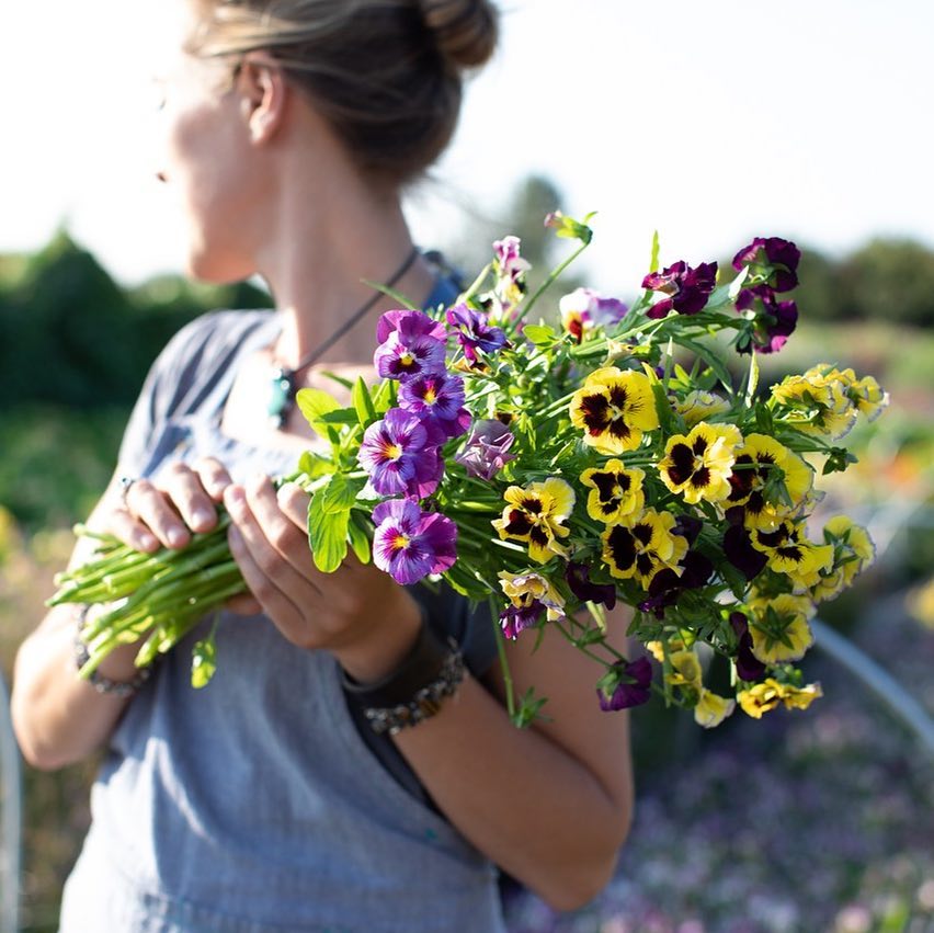 Buscando información encontré de nuevo a una de las reinas de las flores, Erin Benzakein, de Floret, y su artículo sobre el reciente cultivo de pensamientos (Viola x wittrockiana) y violas (Viola cornuta) para flor de corte que realizó en su granja. Comenta en dicho artículo que, tras haber visto algunos arreglos florales de diseñadores de prestigio que incluían estas flores, se planteó la posibilidad de cultivarlas y el año pasado hizo ya su primer ensayo con 40 variedades.