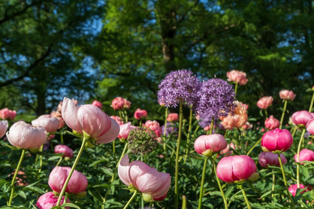 A finales de la primavera, las flores de peonías herbáceas híbridas coinciden con la vistosa floración de ajos ornamentales, como Allium Globemaster y Allium hollandicum ‘Purple Sensation’. Compitiendo en belleza, las flores de Lamprocapnos spectabilis (corazón sangrante) iluminan también el jardín.