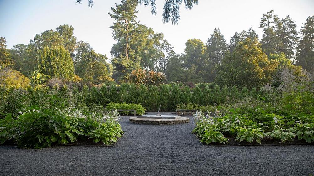A la floración de las peonías le suceden la de otras especies de herbáceas perennes, como los astilbes híbridos (Astilbe × arendsii ‘Erika’ y Astilbe × hybrida ‘Gloria Purpurea’), que a principios de julio crean una hermosa alfombra rosa alrededor del histórico reloj de sol situado en el centro del Peony Garden.