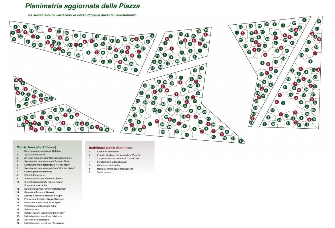 Las fotos son magníficas, pero además tenemos la suerte de contar también con los detalles del esquema de plantación de Piet Oudolf que facilita la organización del evento (Arketipos) en su sitio web y que podéis descargar aquí. Hay que tener en cuenta que, como suele suceder con los diseños para este tipo de eventos, ha habido algunos cambios en ese plan.