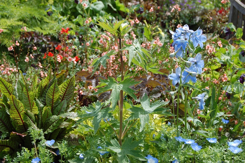 Parece ser que otros elementos clave de la plantación vendrán de la mano de las sutiles flores de Echinacea pallida; las agujas de flores de color azul claro de Delphinium‘Cliveden Beauty’; las cabezas de flor color púrpura y flósculos blancos de Centaurea‘Purple Heart’, preciosa, por cierto; Nicotiana langsdorffii con panículas de flores largas y tubulares con forma de campana, de color verde claro;  y Eryngium alpinum, espectacular, con grandes cabezas de flores de color púrpura, rodeado de brácteas brillantes de color azul vivo y sostenidas por tallos azules.