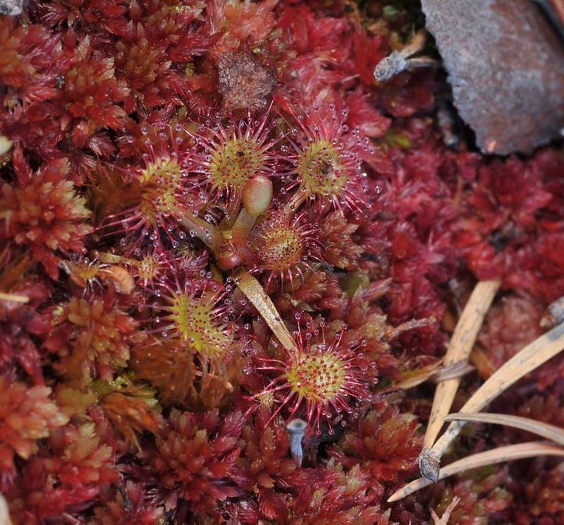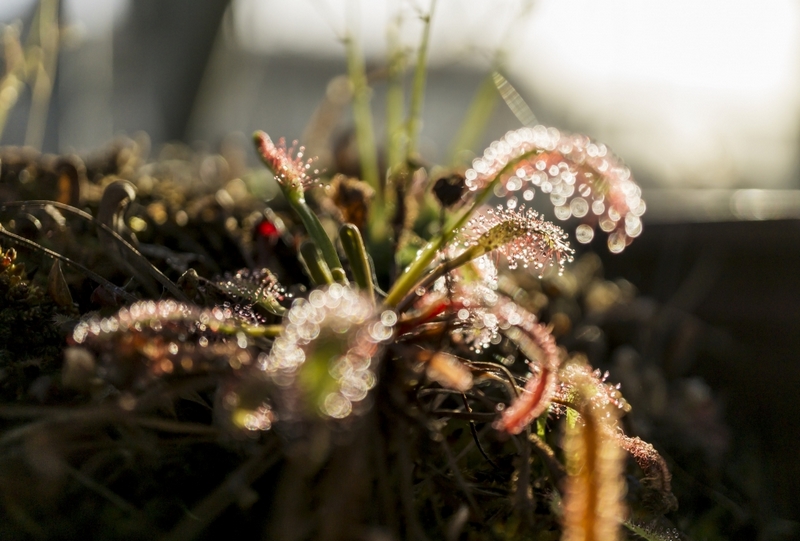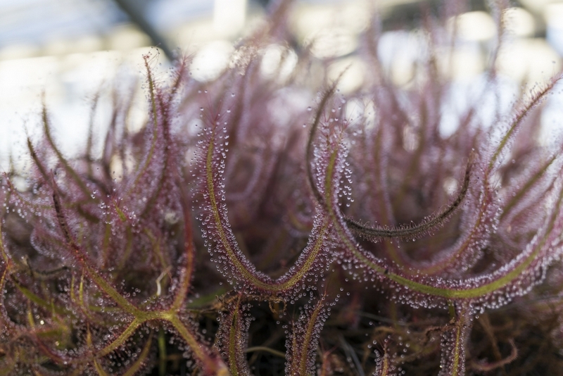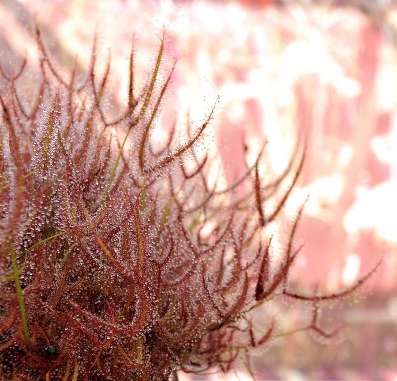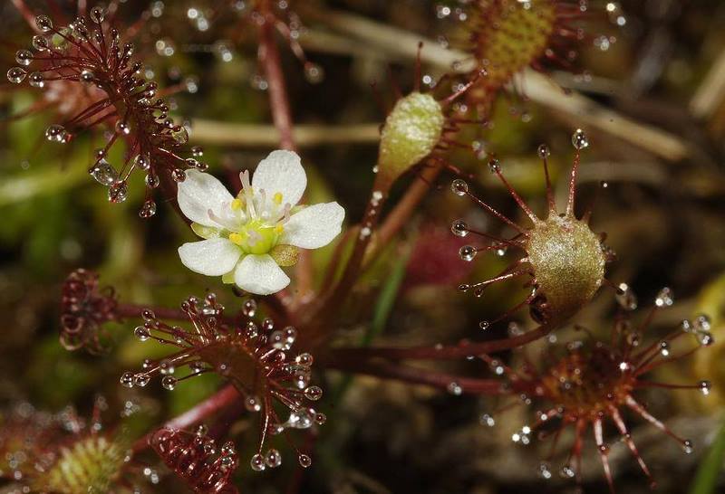 Sus hojas se prolongan en unos pelos, cuyas células terminales segregan una sustancia pegajosa (mucílago) que queda a modo de gota en el extremo.