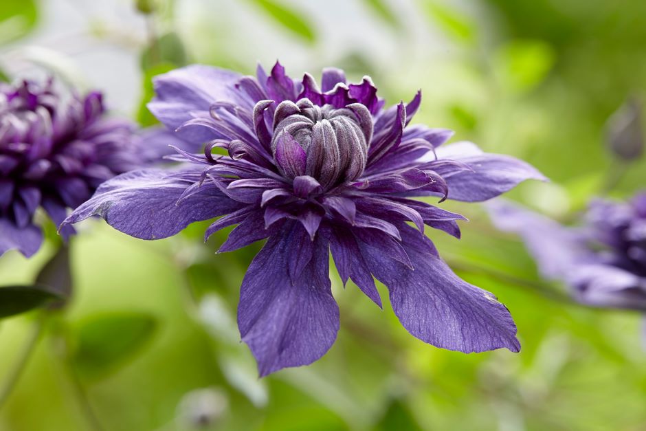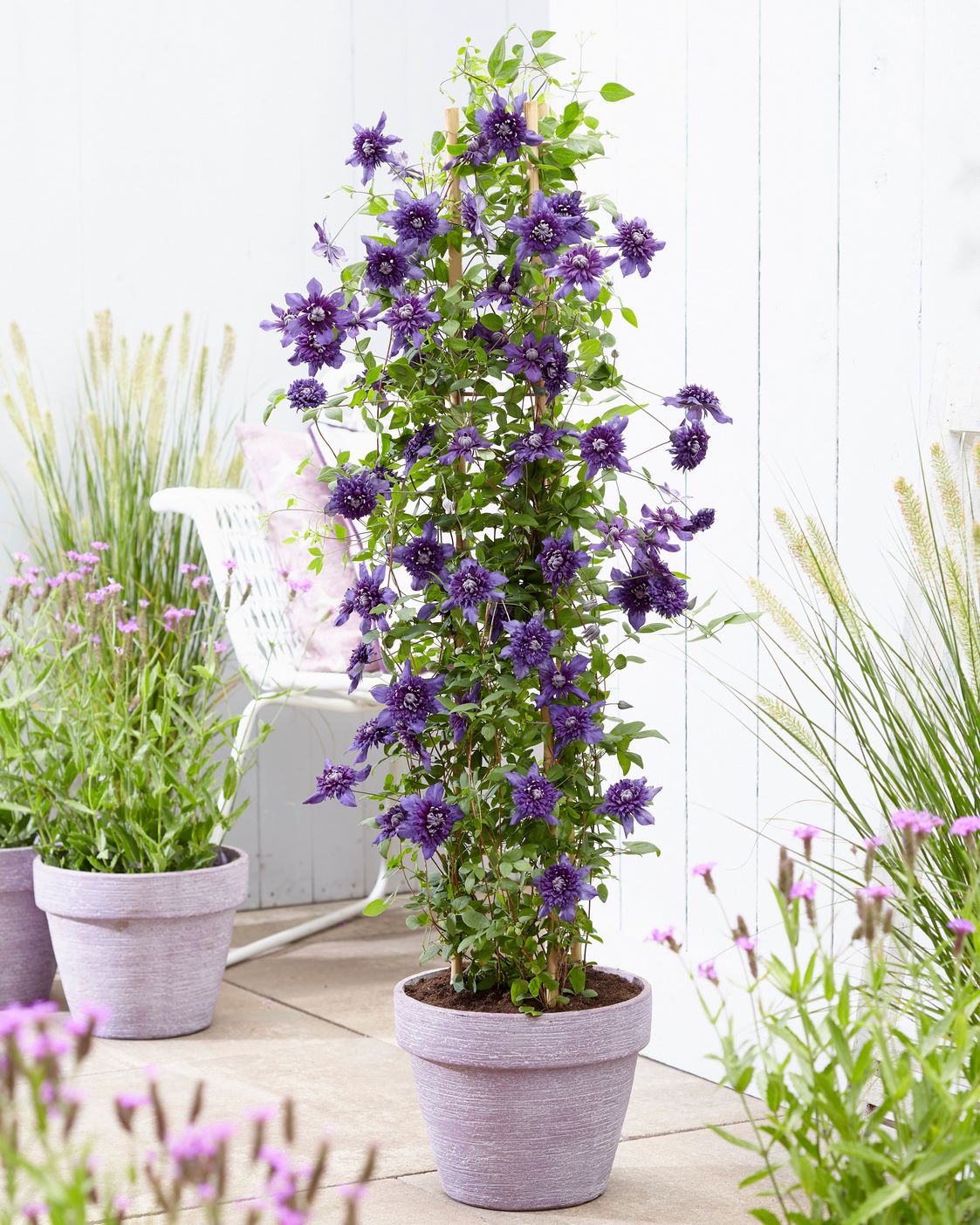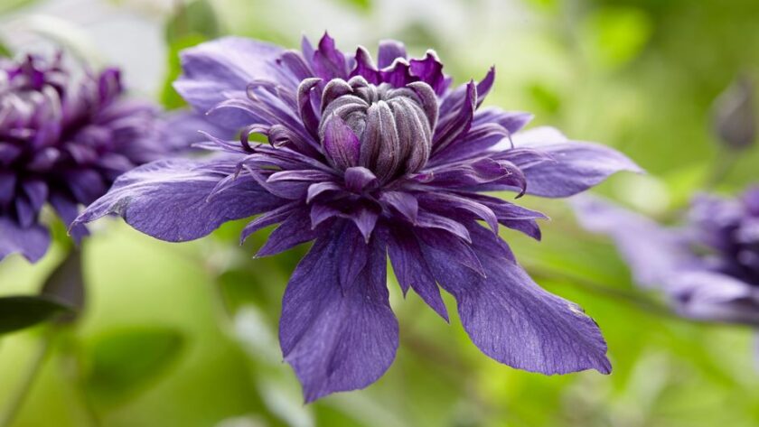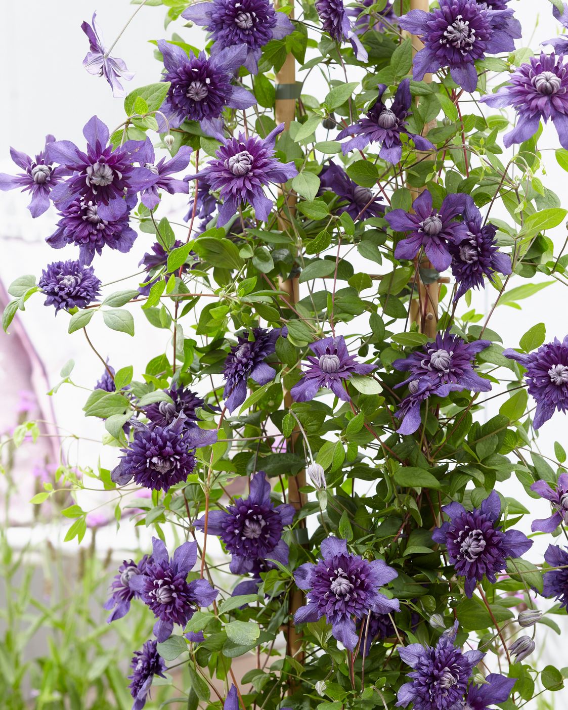 Las abundantes flores que produce Clematis‘Kokonoe’ en una sola planta son de color púrpura cálido y aparecen desde finales de la primavera hasta principios de otoño. Una trepadora que puede alcanzar 2,50 metros de altura y 1 m de ancho; luce muy bien sola y puede cultivarse en la terraza o el balcón, contra una pared, en un contenedor misto o una cesta colgante.