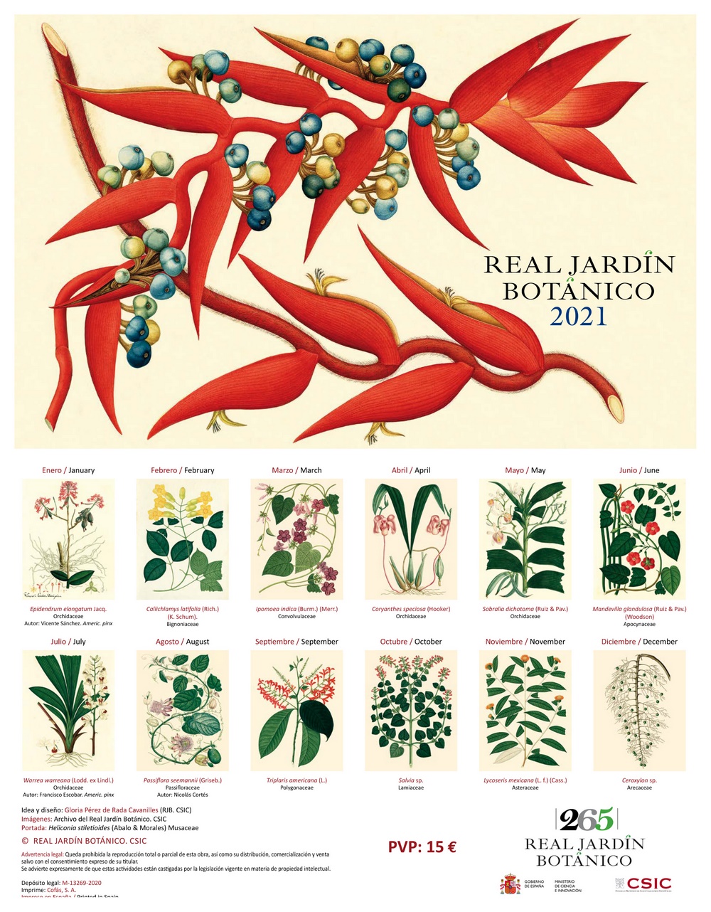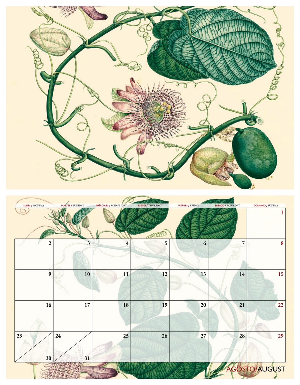Todo esto es lo que nos comentan desde el RJB-CSIC acerca de esa colección, que tiene el reconocimiento del Registro de Memoria del Mundo de la UNESCO para América Latina y el Caribe (UNESCO-MOWLAC), al tiempo que nos comunican que el nuevo calendario, del que se han editado 2.500 ejemplares, ya está disponible en la tienda del Botánico y, desde el 7 de septiembre, también se puede adquirir online en este enlace. El precio de venta es 15 euros e incluye cuatro láminasque se pueden enmarcar y que se ofrecen gratuitamente. Dicho queda y avisados estáis. Yo estoy deseando que llegue el mes de agosto de 2021 para disfrutar de la ilustración de Passiflora seemannii trepando por la pared.