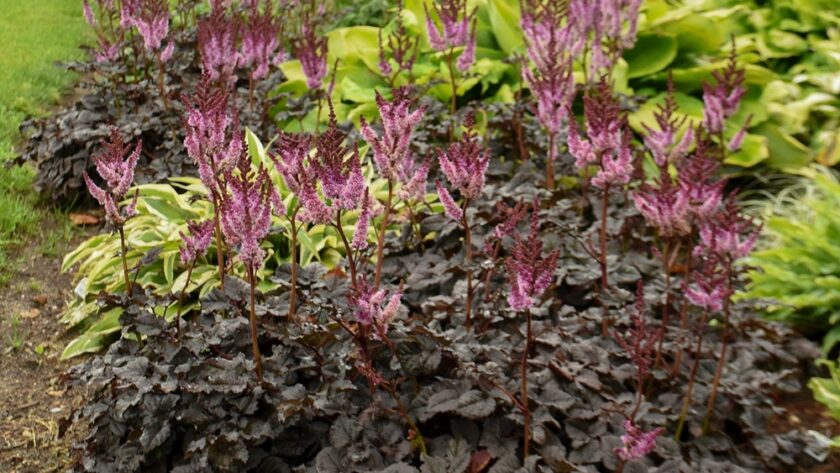 Astilbe ‘Dark Side of the Moon’ es una planta vivaz con hojas jóvenes de color verde amarillo con un borde burdeos, que se transforman en un llamativo color púrpura chocolate oscuro a medida que envejecen. Entre junio y agosto, el vistoso follaje contrasta con yemas de color malva que se abren en flores de color púrpura rosado, sostenidas en tallos florales verticales de color rojo oscuro.