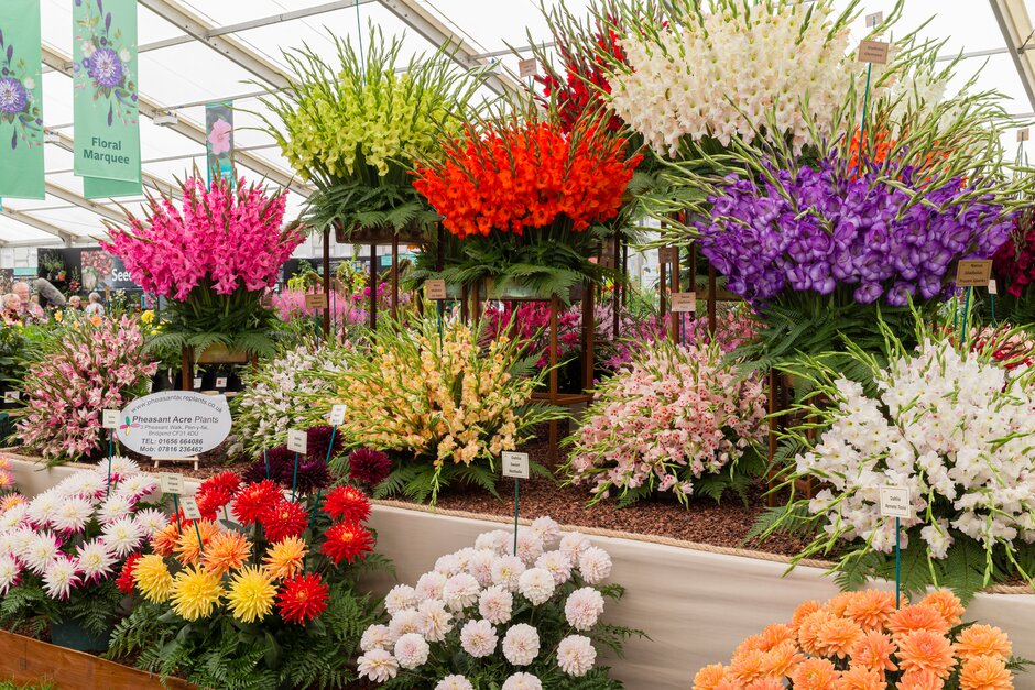 Gladiolos y dalias en el Floral Marquee (Pheasant Acre Plants) •• RHS / Neil Hepworth