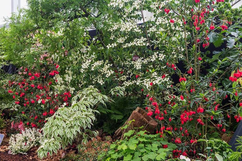 Destaca la espectacular presentación con variedades y cultivares de fucsias (Fuchsia), que incluyen un cultivar rústico muy popular: Fuchsia ‘Linda Hinchcliffe’.
