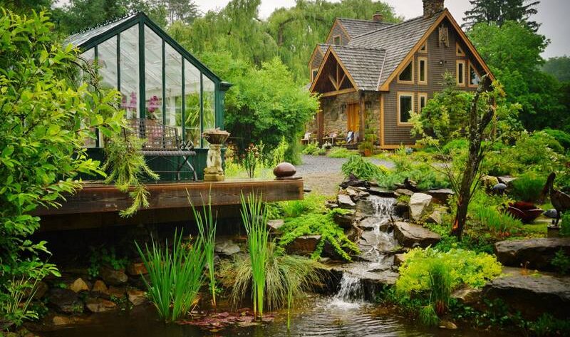 Ficus sycomorus), el roble (Quercus) o el sauce (Salix). Un amplio jardín informal se arremolina en torno a una casa de estilo Arts & Crafts, aprovechando las vistas de la naturaleza circundante, tal y como dictan las costumbres de esa corriente.
