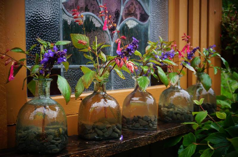 | Salvia en botellas de cristal •• Jardín en Saratoga Springs, New York |