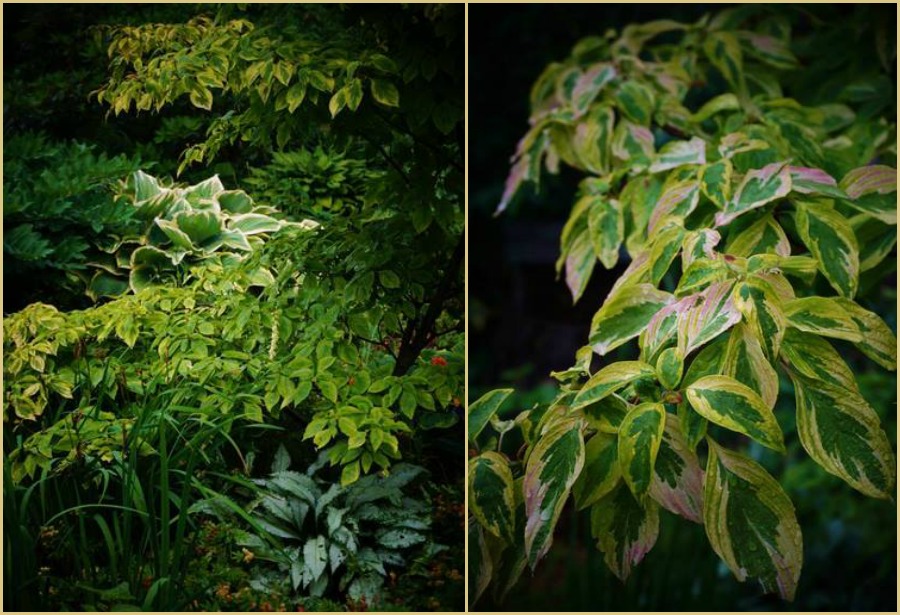 | Cornus y hostas (izda.) y Cornus ‘Golden Shadows’ •• Saratoga Springs, New York |