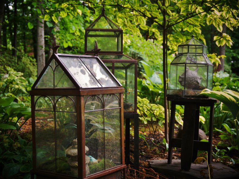 | Terrarios de metal en el jardín de Wynne Trowbridge (Shades of Green Nursery) •• Charlton, New York |