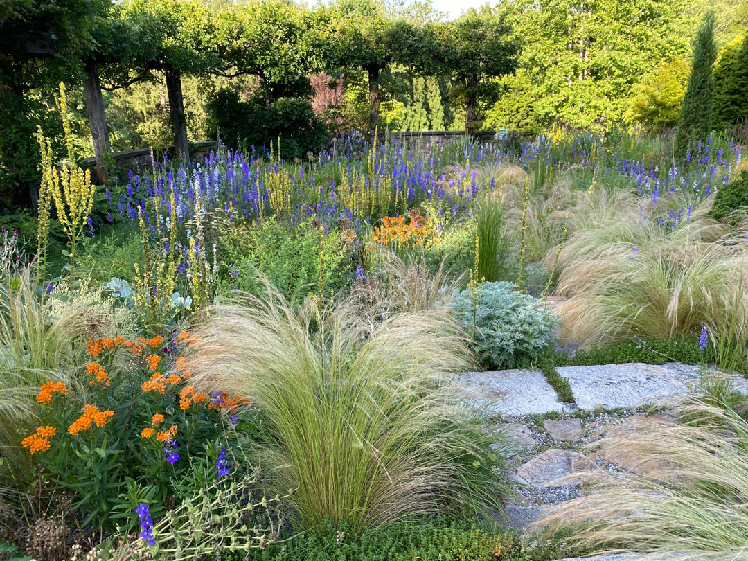 Nassella tenuissima, Asclepias tuberosa, Artemisia ‘Powis Castle’ y Consolida ajacis. Julio 2020