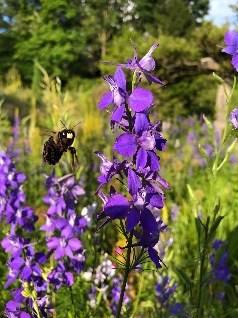 Abejorro carpintero, Xylocopa, en flor de Consolida ajacis, espuela de caballero. Julio2020