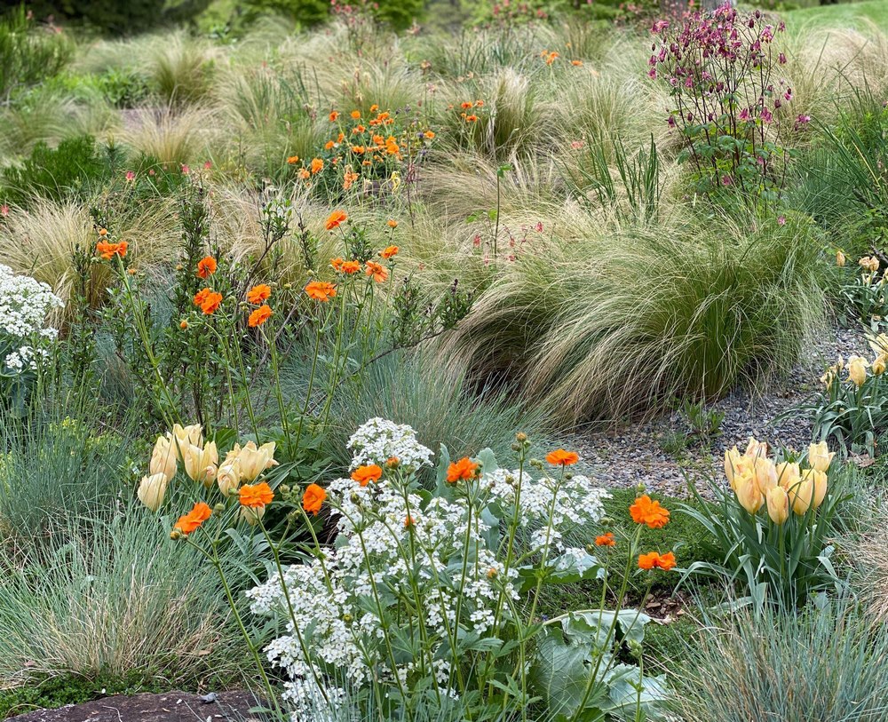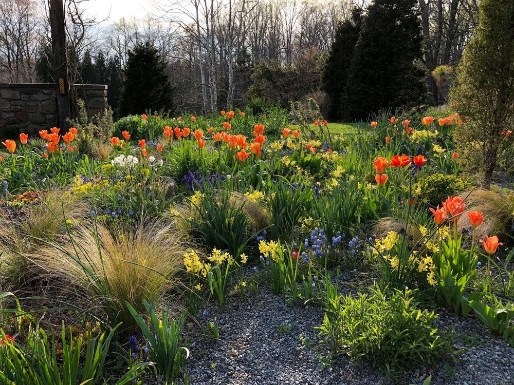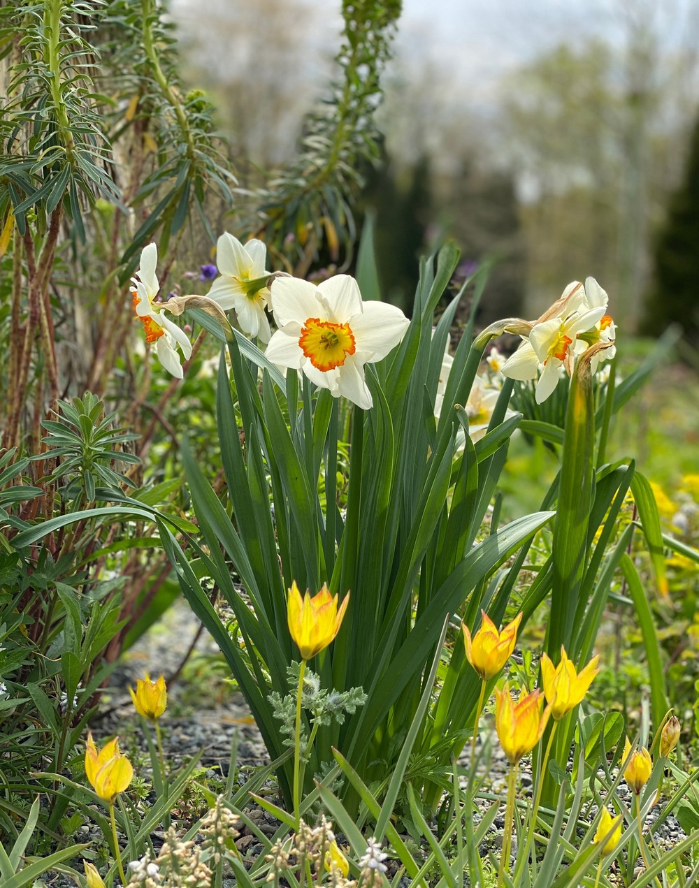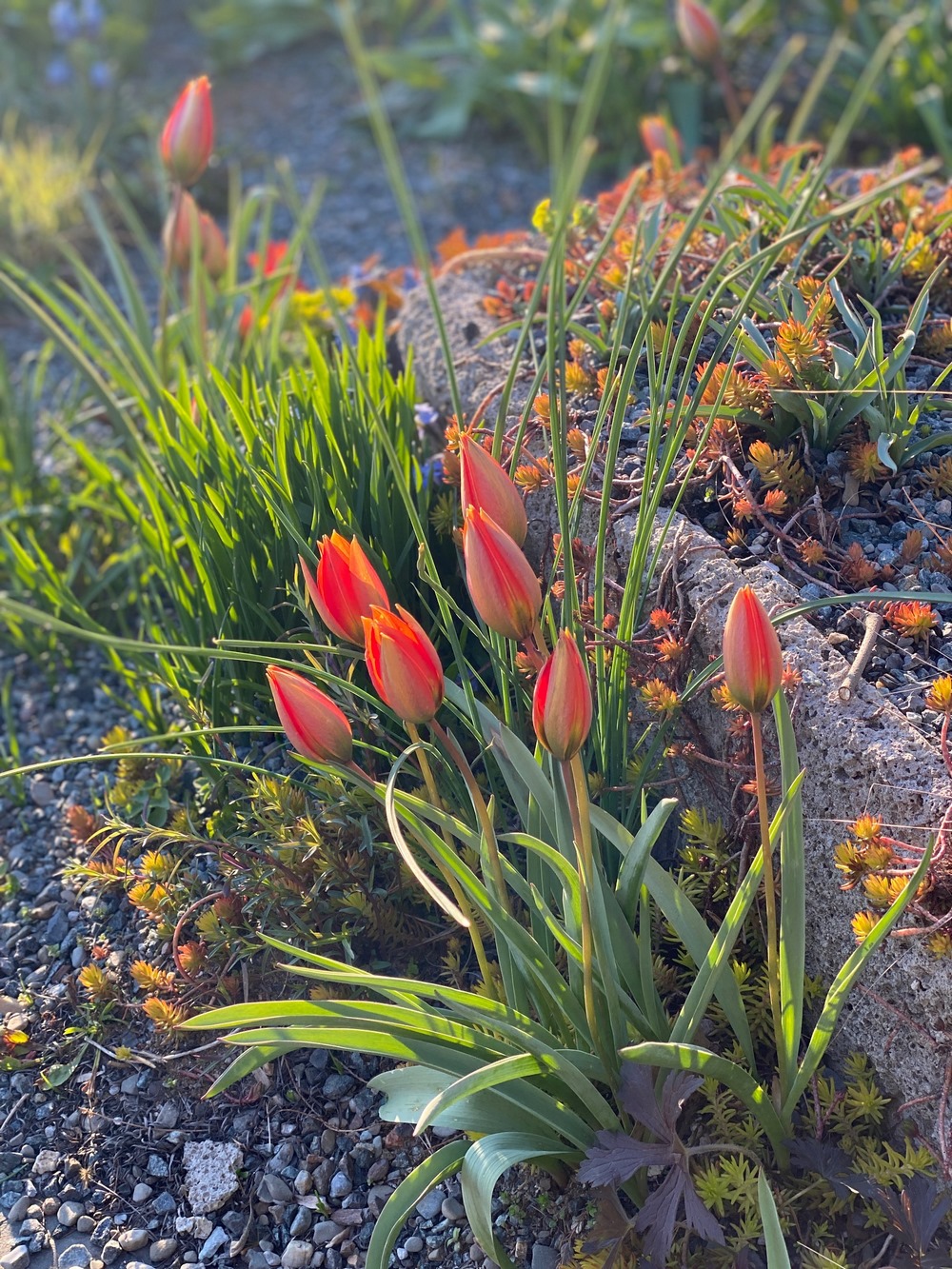 En primavera asoman las flores de algunos bulbos, entre los que se encuentran narcisos miniatura y especies de tulipanes botánicos, como Tulipa acuminata, T. clusiana y T. linifolia, que tienden a ser longevos y prosperan en el suelo seco de este jardín de grava.