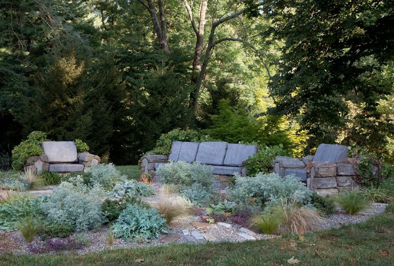 Pero el Gravel Garden, sin embargo, sí está diseñado para no necesitar riegos. Tal y como se indica en el libro, el jardín de grava de Chanticleer Garden se encuentra en una ladera soleada y seca orientada al suroeste. Lavanda, tomillos y herbáceas se mueven con la brisa del verano a través de los grandes escalones de granito que caen en cascada por una pendiente gradual.