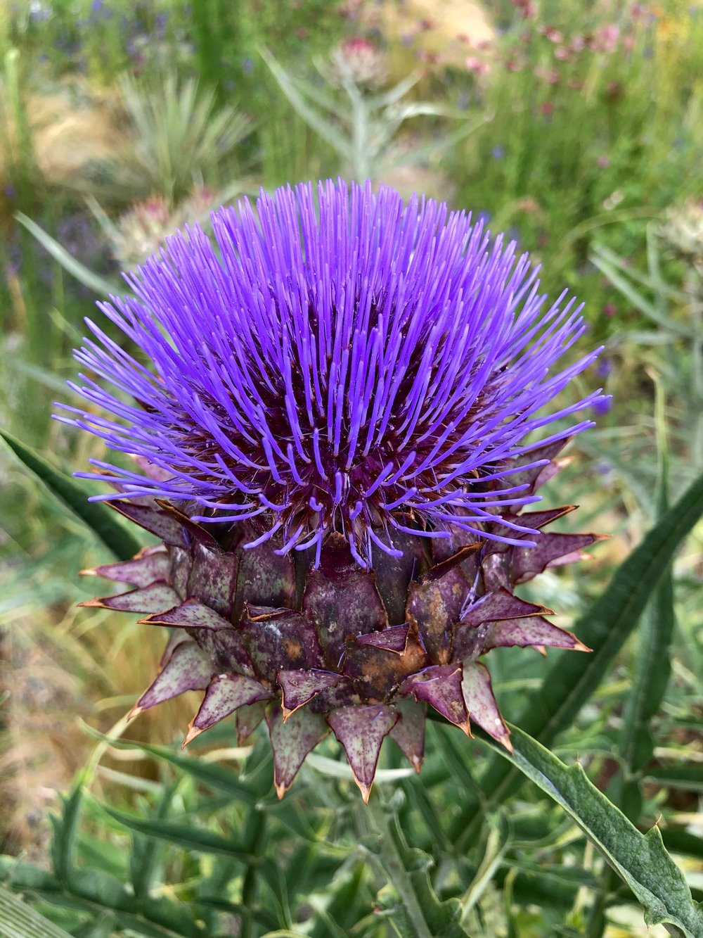 A mediados y finales de la primavera surgen las flores de los últimos bulbos, como Allium, incluido Allium hollandicum «Purple Sensation». En ese mismo periodo, en medio de Nassella tenuissima y lavandas leñosas, surgen las delicadas y elegantes flores magenta del cultivar de un apreciado gladiolo mediterráneo, Gladiolus x byzantinus ‘Cruentus’.