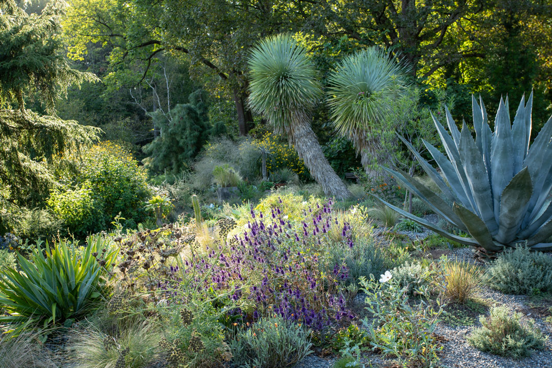 La estructura y altura en ese jardín la aportan plantas suculentas como agaves (A. americana) y yucas (Yucca rostrata), que permanecen en el suelo hasta que llegan las heladas en otoño y se cultivan en el invernadero durante el invierno. Esto es así, no tanto por la intolerancia al frío, sino por la combinación de suelos húmedos y frío. Incluso Lisa Roper recurrió a la plantación de montículos de roca y grava acumulados sobre el nivel del suelo para crear un drenaje brusco.