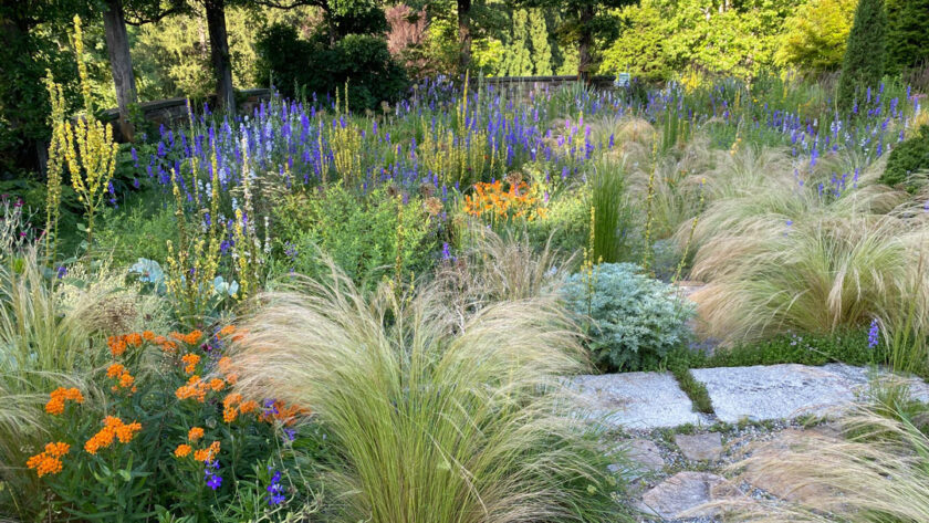 | Jardín de Grava en Chanticleer Garden | Foto Lisa Roper Nassella tenuissima, Asclepias tuberosa, Artemisia ‘Powis Castle’ y Consolida ajacis. Julio 2020 |