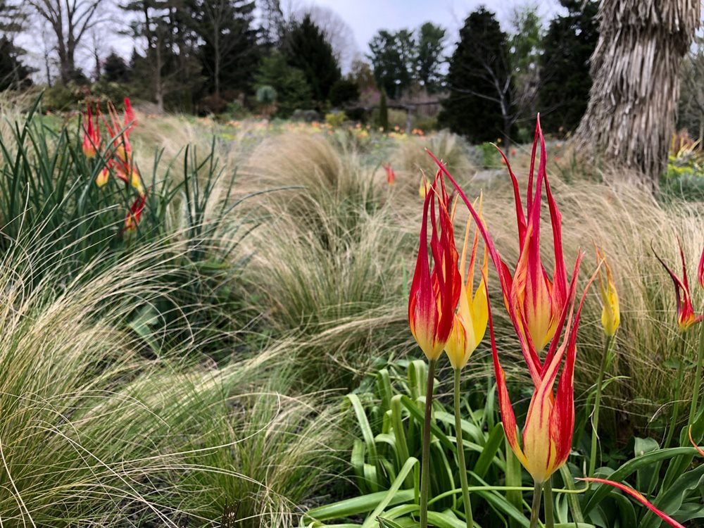 | Aquilegia canadensis, Nassella tenuissima y Tulipa acuminata. Mayo 2020 Foto Chris Fehlhaber |