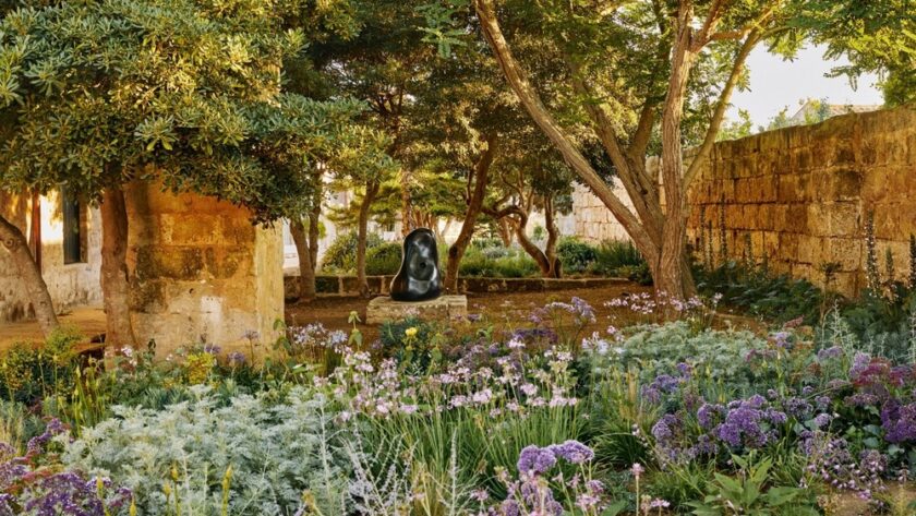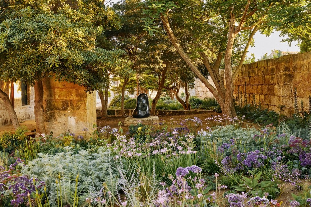 | Jardín de Piet Oudolf en Hauser & Wirth Menorca. Eduardo Chillida, Elogio del vacío VI, 2000 | Foto Daniel Schäfer – Hauser & Wirth |