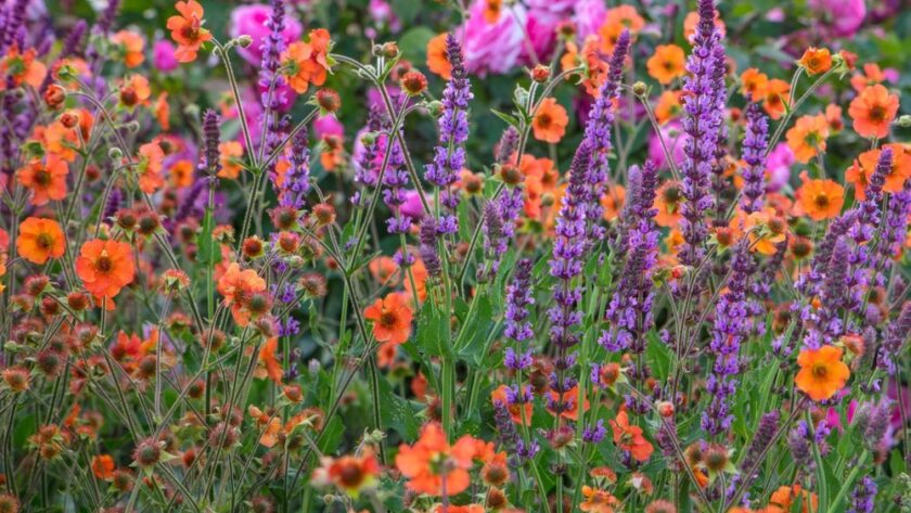 Las grandes flores en forma de roseta de color rosa brillante de Rosa ‘Gertrude Jekyll’ pueden plantarse junto a vivaces como Geum ‘Totally Tangerine’, con flores anaranjadas, y Salvia nemorosa ‘Amethyst’, con flores azul violeta, creando una audaz combinación.
