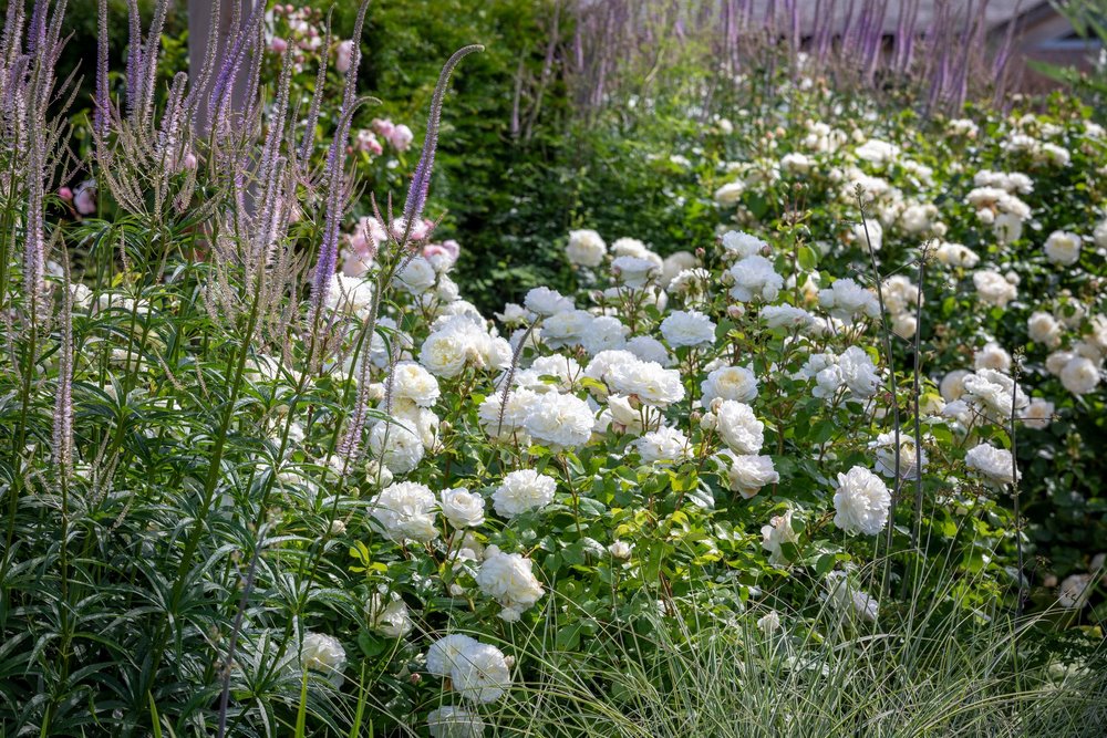 Si queremos crear un interesante contraste con nuestras rosas de color blanco, como Rosa ‘Desdemona’, una buena elección es combinarlas con flores rojas, como las de Astrantia major ‘Claret’. Siempre exitosa también la combinación del purpura y blanco, que se puede obtener, por ejemplo, con Rosa ‘Tranquillity’ y Veronicastrum virginicum ‘Fascination’, o las flores sencillas de Rosa ‘Kew Gardens’ junto a las espigas de Nepeta.